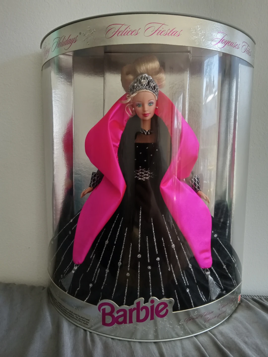 This is a Happy Holidays Barbie doll. It features a festive black gown adorned with sparkling details and a vibrant pink accent piece. It's a collectible item perfect for holiday displays.