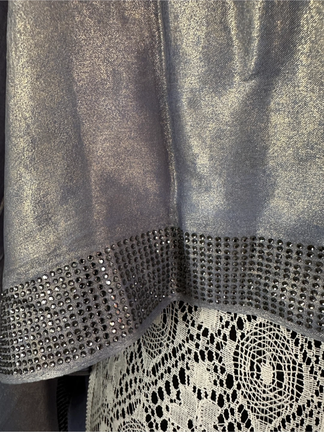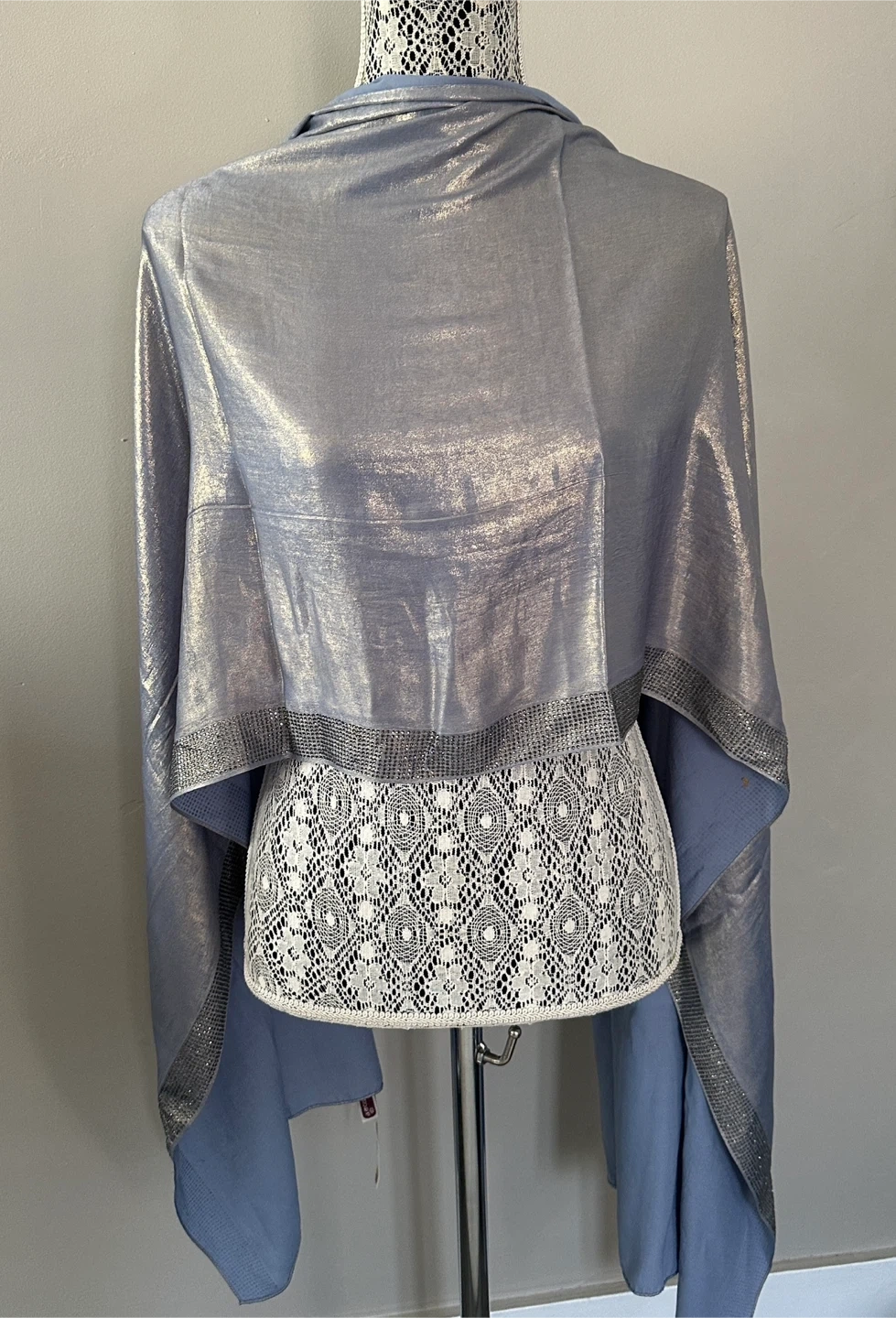 This sparkly blue shawl scarf is embellished with rhinestones along the border. It's made from a shimmering, lightweight fabric. It offers a touch of elegance to any outfit!
