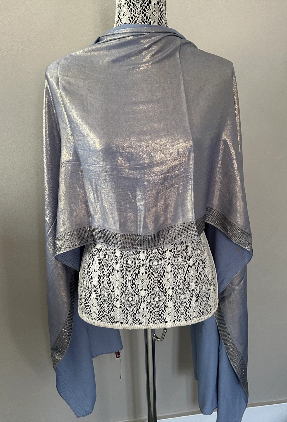 This sparkly blue shawl scarf is embellished with rhinestones along the border. It's made from a shimmering, lightweight fabric. It offers a touch of elegance to any outfit!