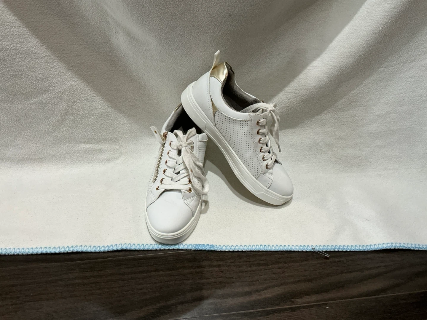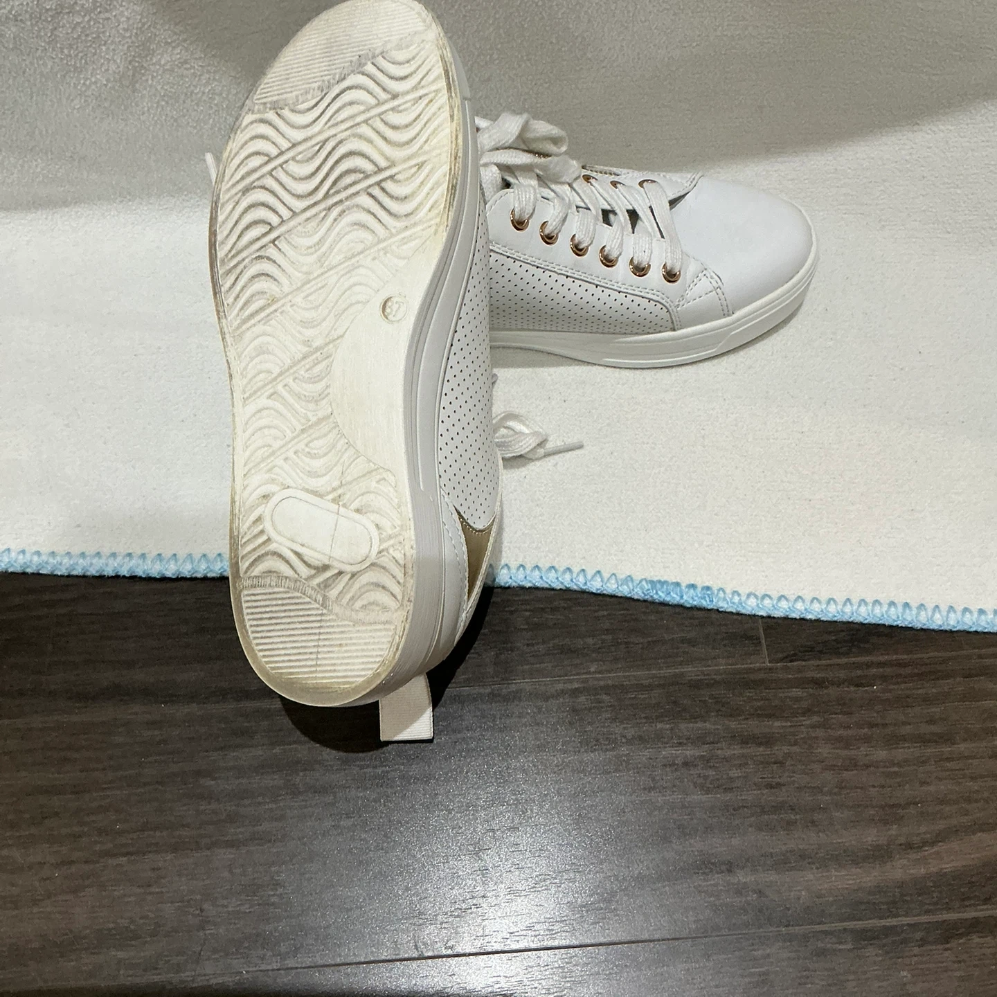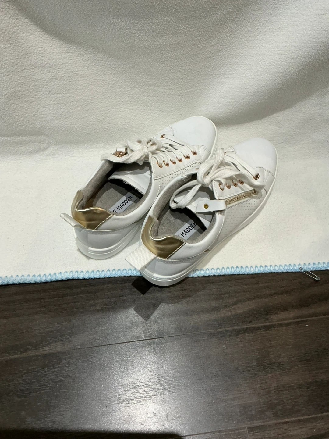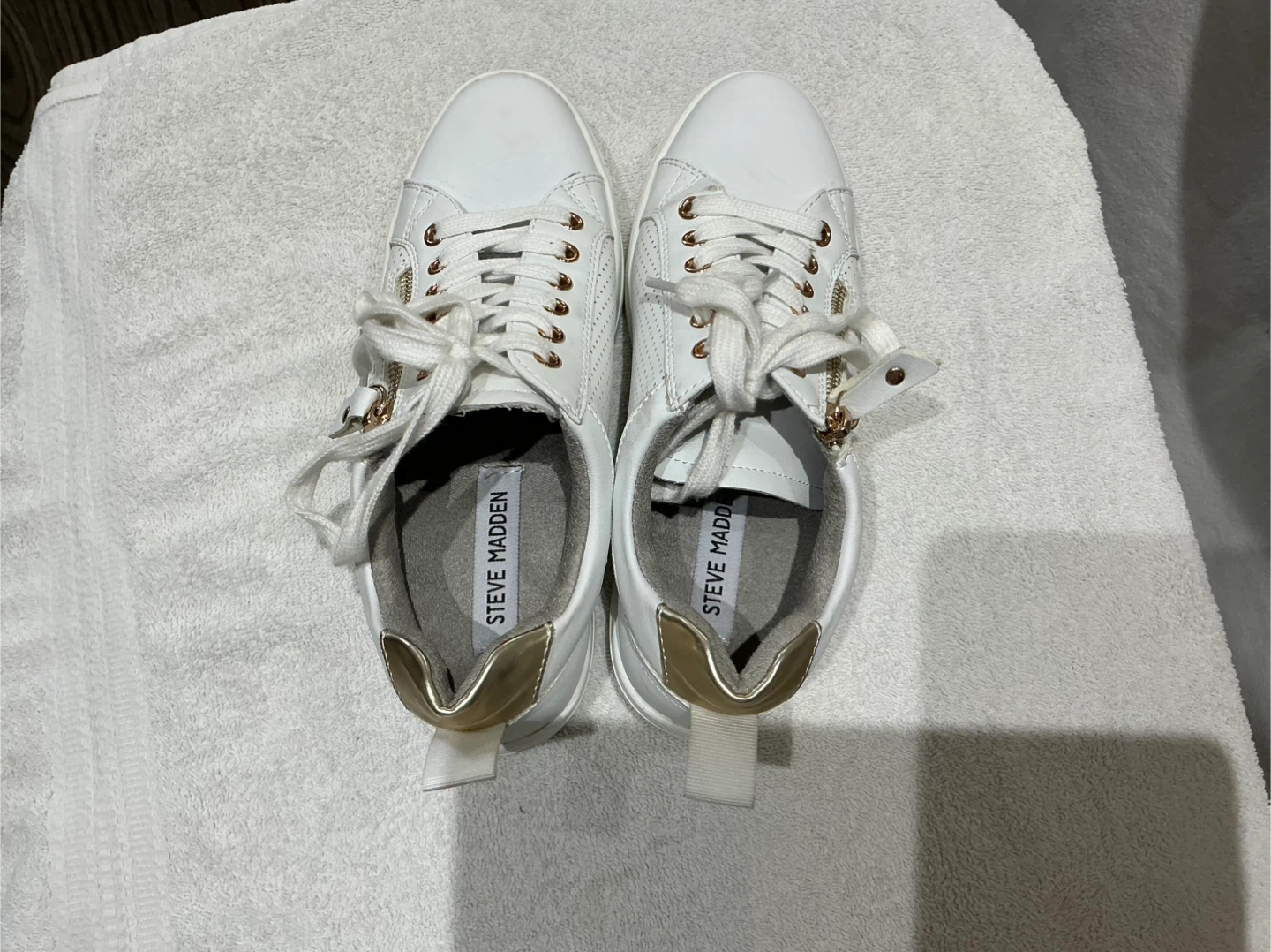 These are Steve Madden white leather sneakers. They feature gold accent details and side zippers. Perforated details on the sides add breathability.