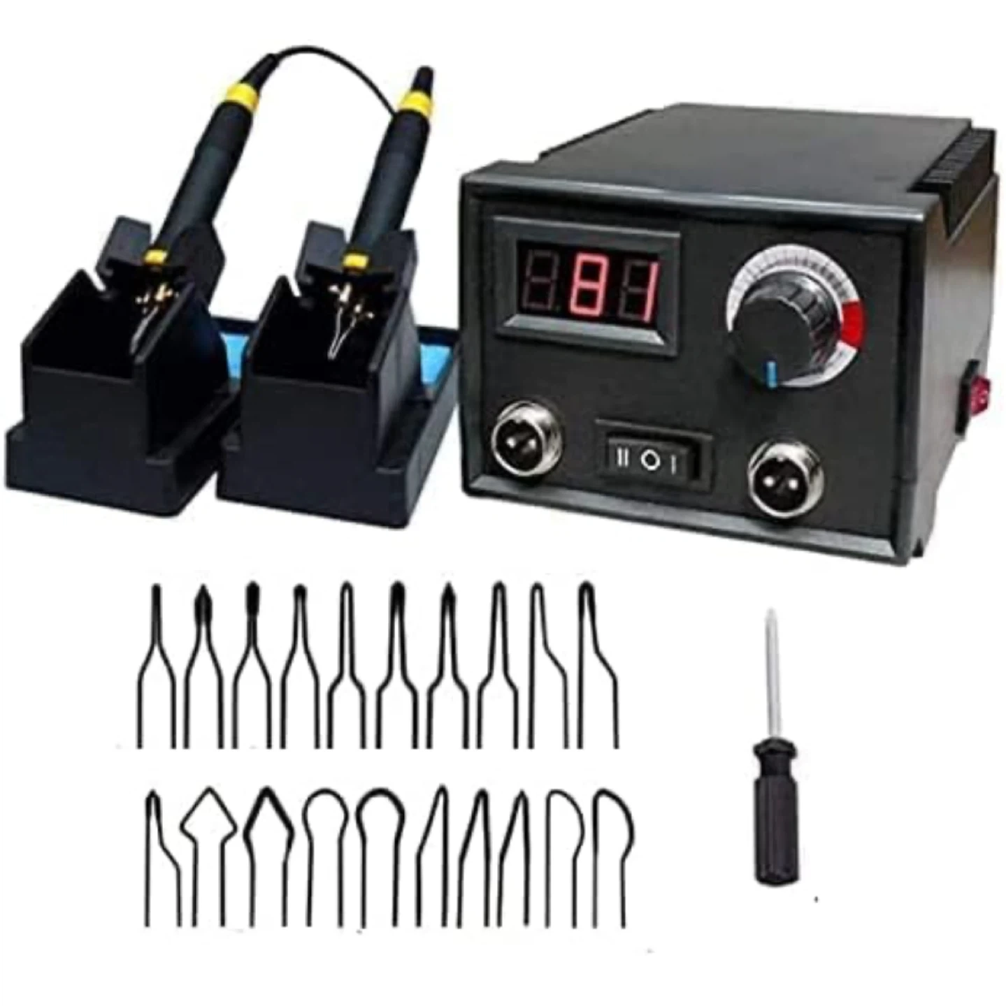 This wood burning kit comes with two pens and a digital temperature control unit. It includes a variety of tips for different designs. The unit is suitable for users of all skill levels, allowing for precise temperature adjustments. Great for crafters and artists!