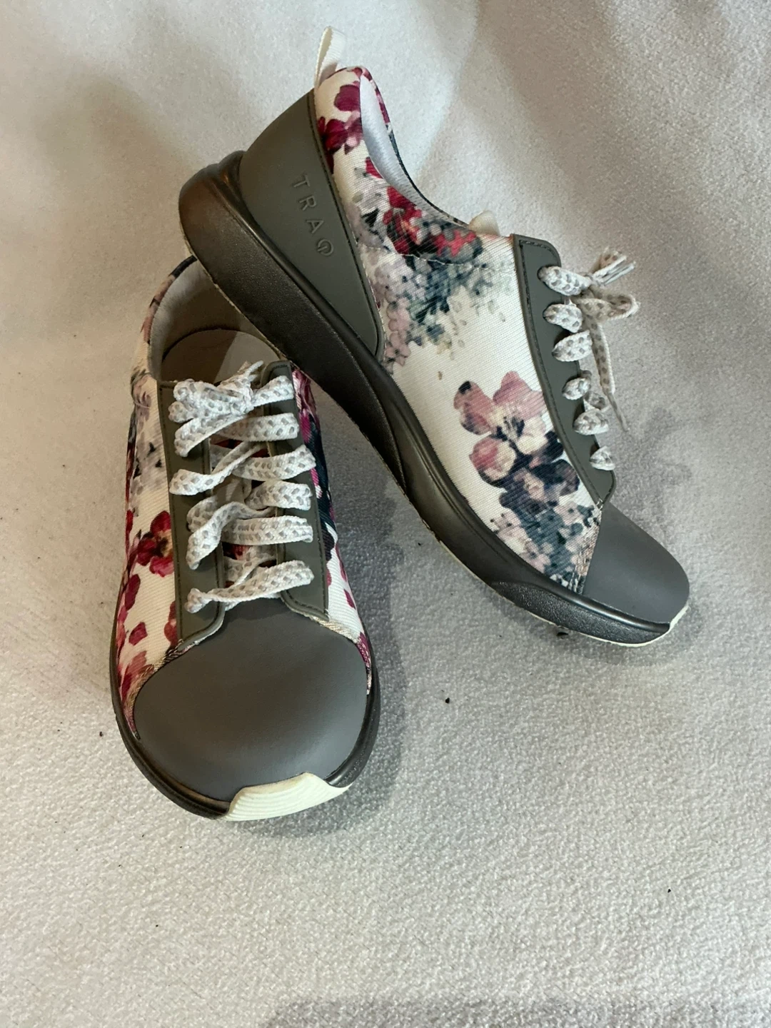 These TRAQ by Alegria sneakers feature a vibrant floral print with a grey toe cap and sole. They have a comfortable, casual design perfect for everyday wear. The shoes are lightweight with lace-up closure.