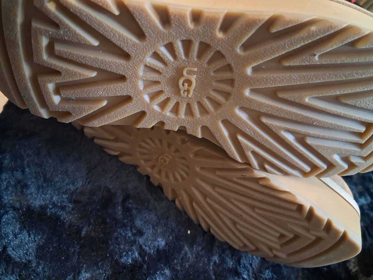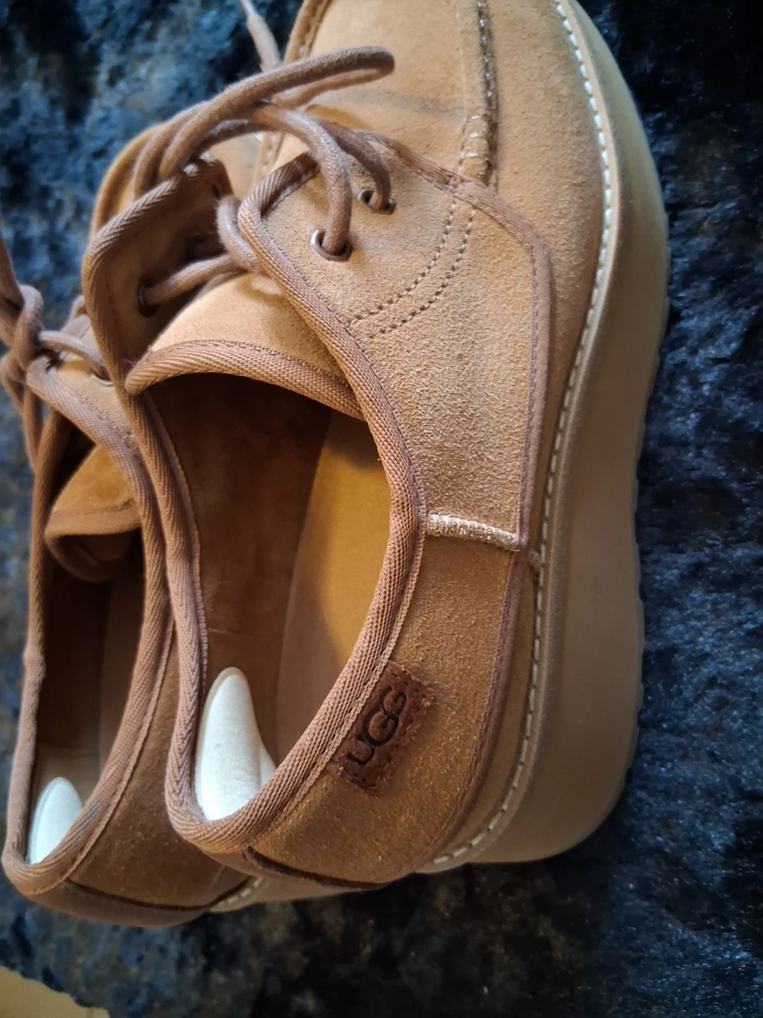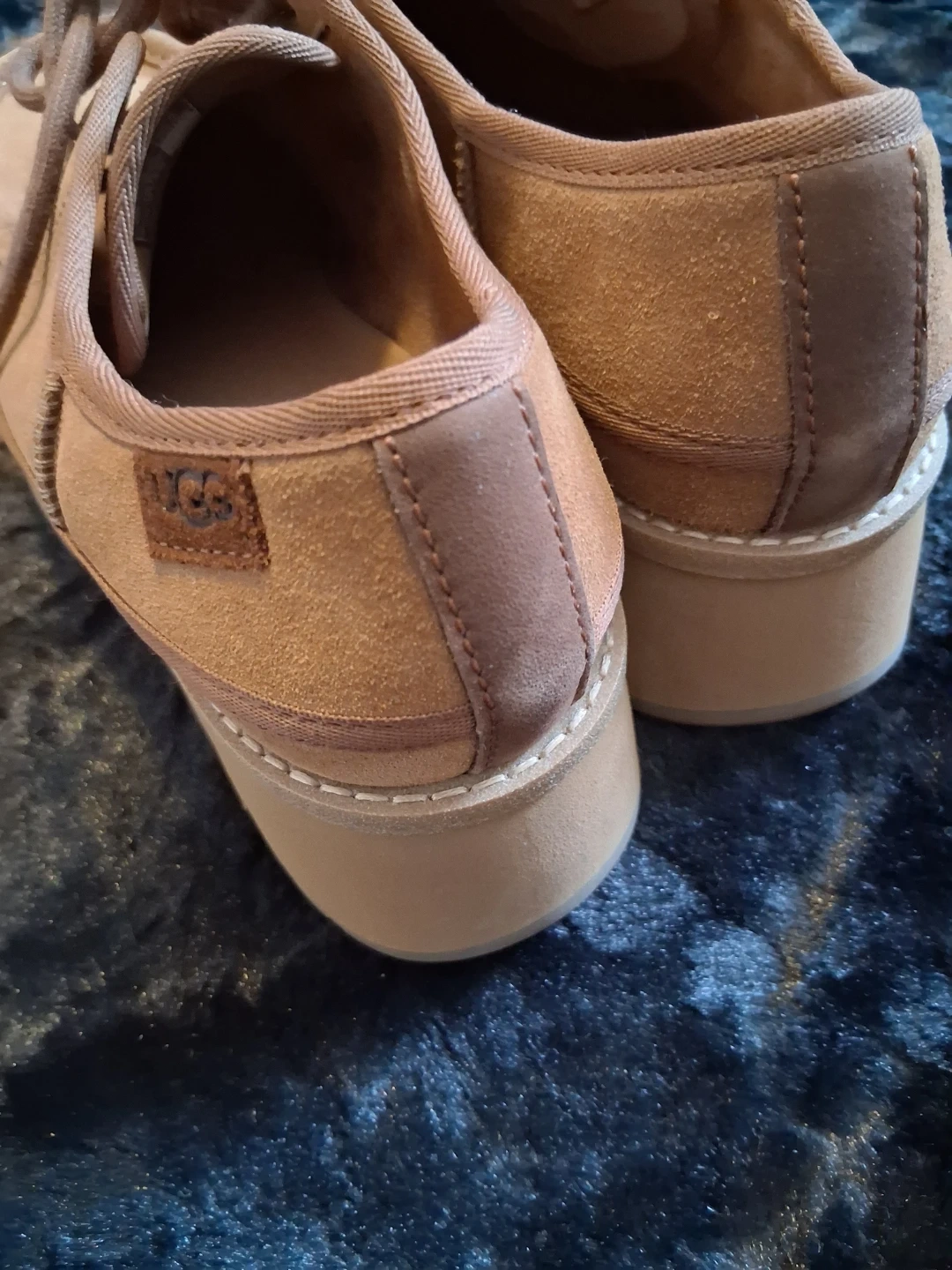 These tan UGG shoes are made from suede with a comfortable platform sole. They feature a classic slip-on design with laces for adjustability. Suede material.