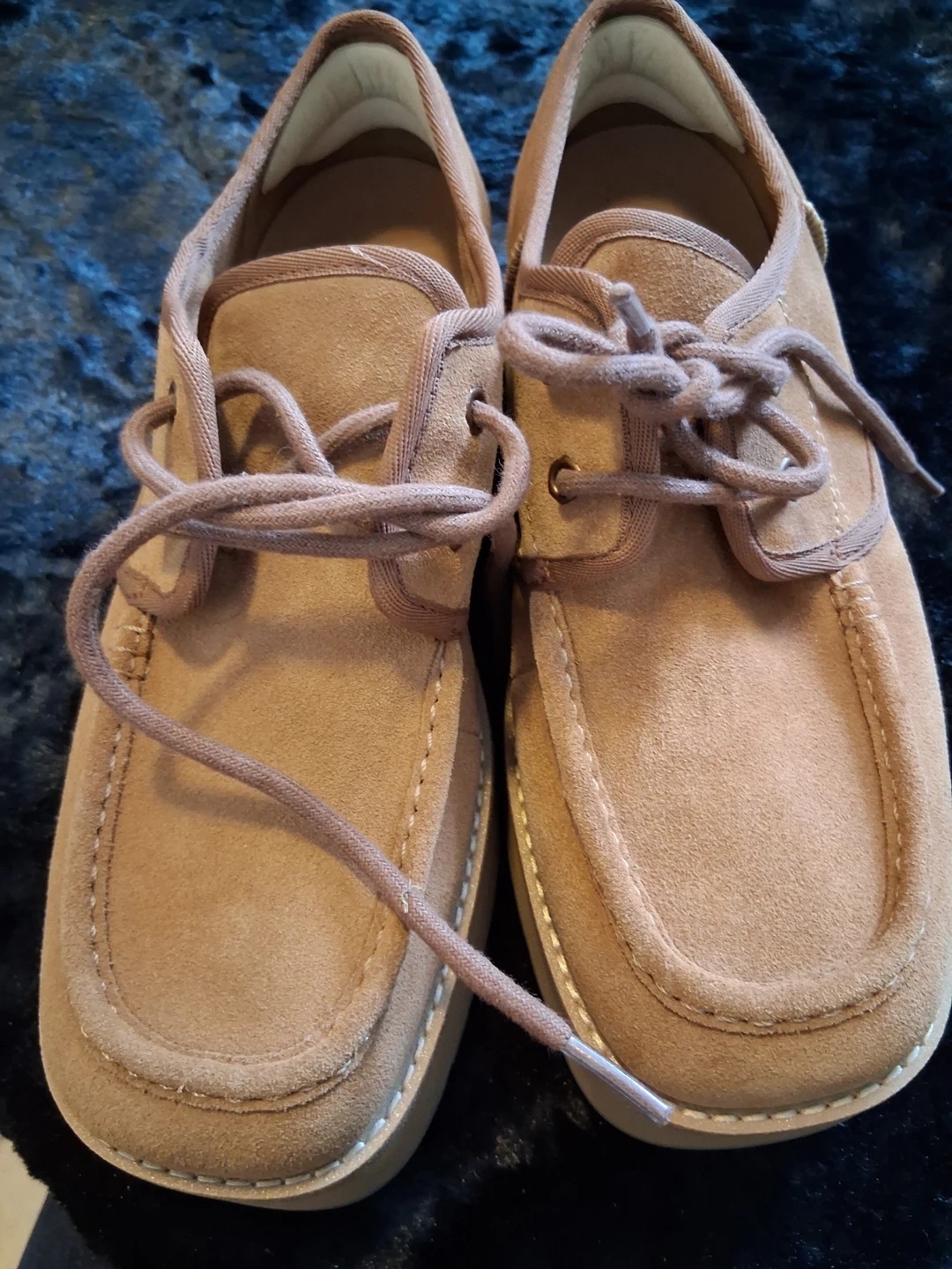 These tan UGG shoes are made from suede with a comfortable platform sole. They feature a classic slip-on design with laces for adjustability. Suede material.