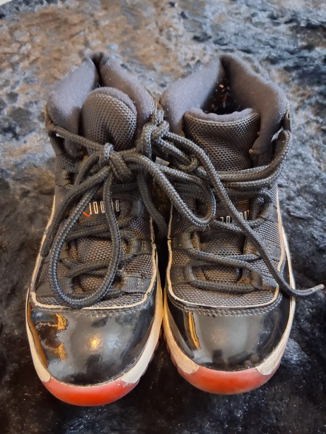 Black and red toddler Jordan 11 Retro sneakers. Features patent leather toe and accents. Durable rubber sole.