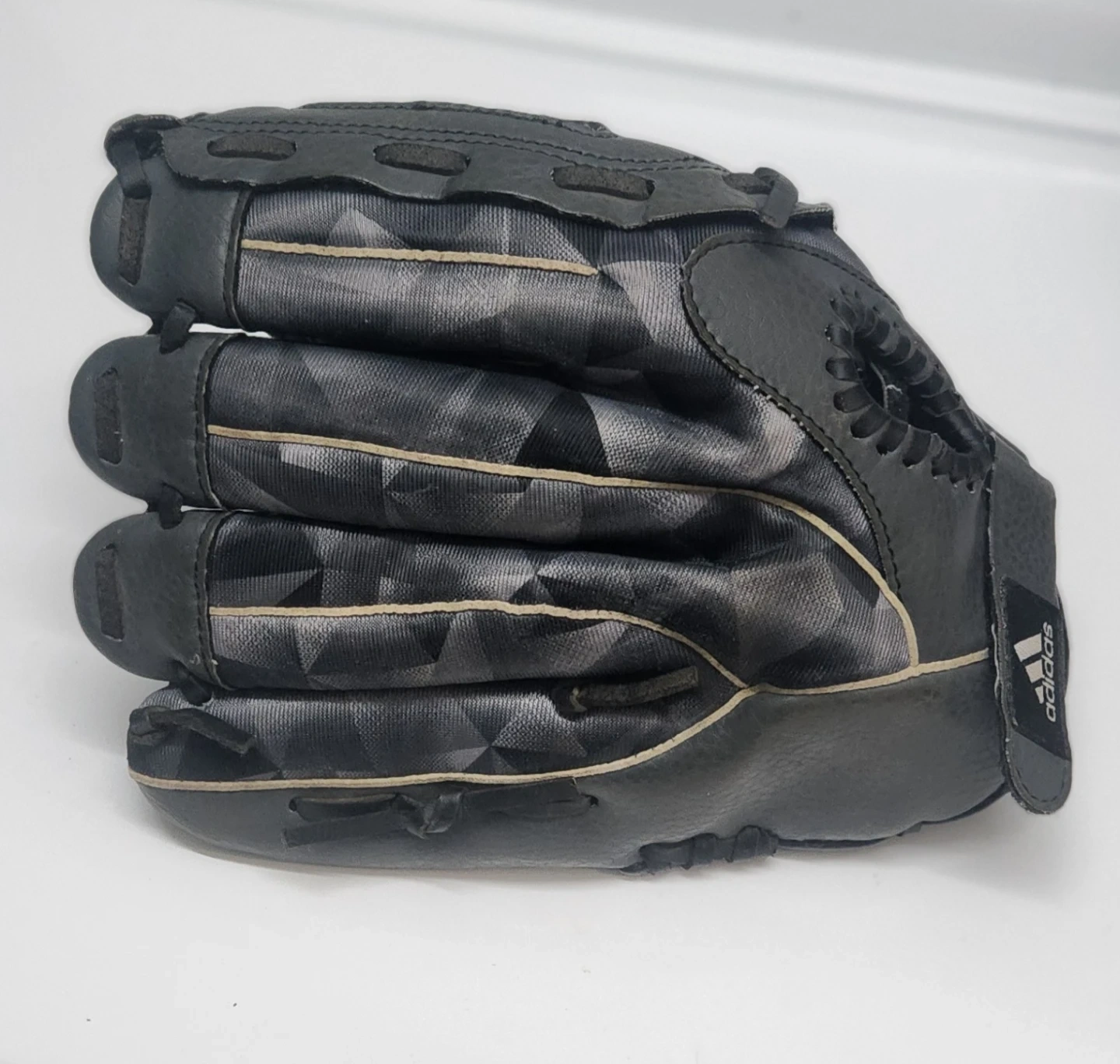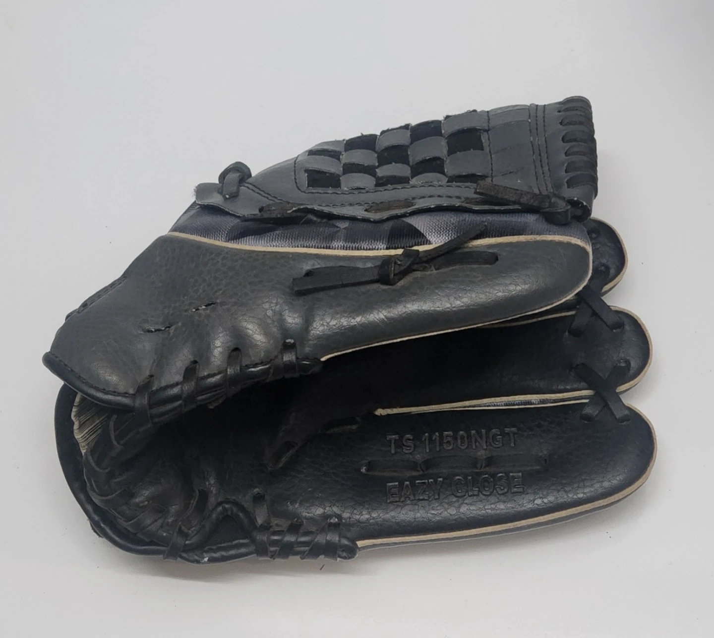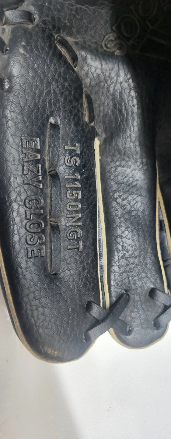 Black Adidas baseball glove with "TS 1150NGT EASY CLOSE" embossed. It's made of leather and has a checkered accent inside. This glove's design makes it easy to close.
