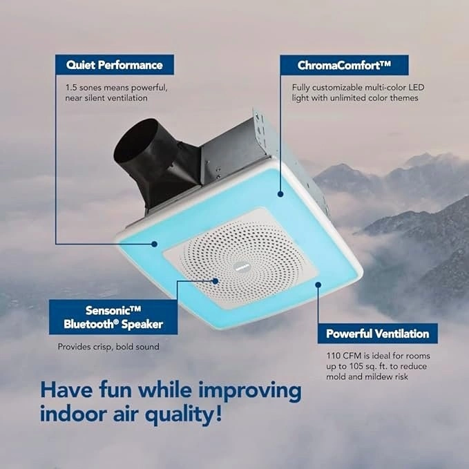Brand new, compare at $200+ online. BATHROOM VENTILATION FAN: Allows you to personalize the ambience in your bathroom with a 24-color LED light for endless options and Sensonic Bluetooth speaker with crisp and bold sound. CUSTOMIZE WITH CONVENIENCE: Change themes, adjust fan, and more with the Apple or Android App while enjoying music with wireless, battery-powered wall control (2 AAA batteries required, not included). ULTRA-QUIET POWER: Operates at 110 CFM at 1.5 sones for a super quiet yet highly effective performance each time, so you won't need to worry about background noises interrupting your music. EASY ROOMSIDE INSTALLATION: Utilizes an EZDUCT connector for fast and simple installation with no attic access required. APP CONNECTIVITY: Factory set PIN is 1234, go to ChromaComfort App instructions for more details (app not compatible with Samsung Galaxy S21 or Google Pixel 6 smartphones).