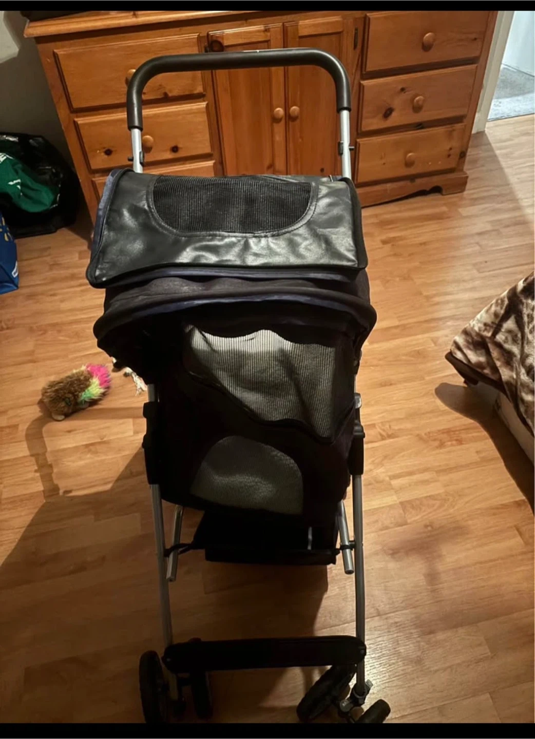 This pet stroller is great for taking your furry friend along. It features mesh windows for ventilation and a comfy interior. Easy to manoeuvre on most surfaces.