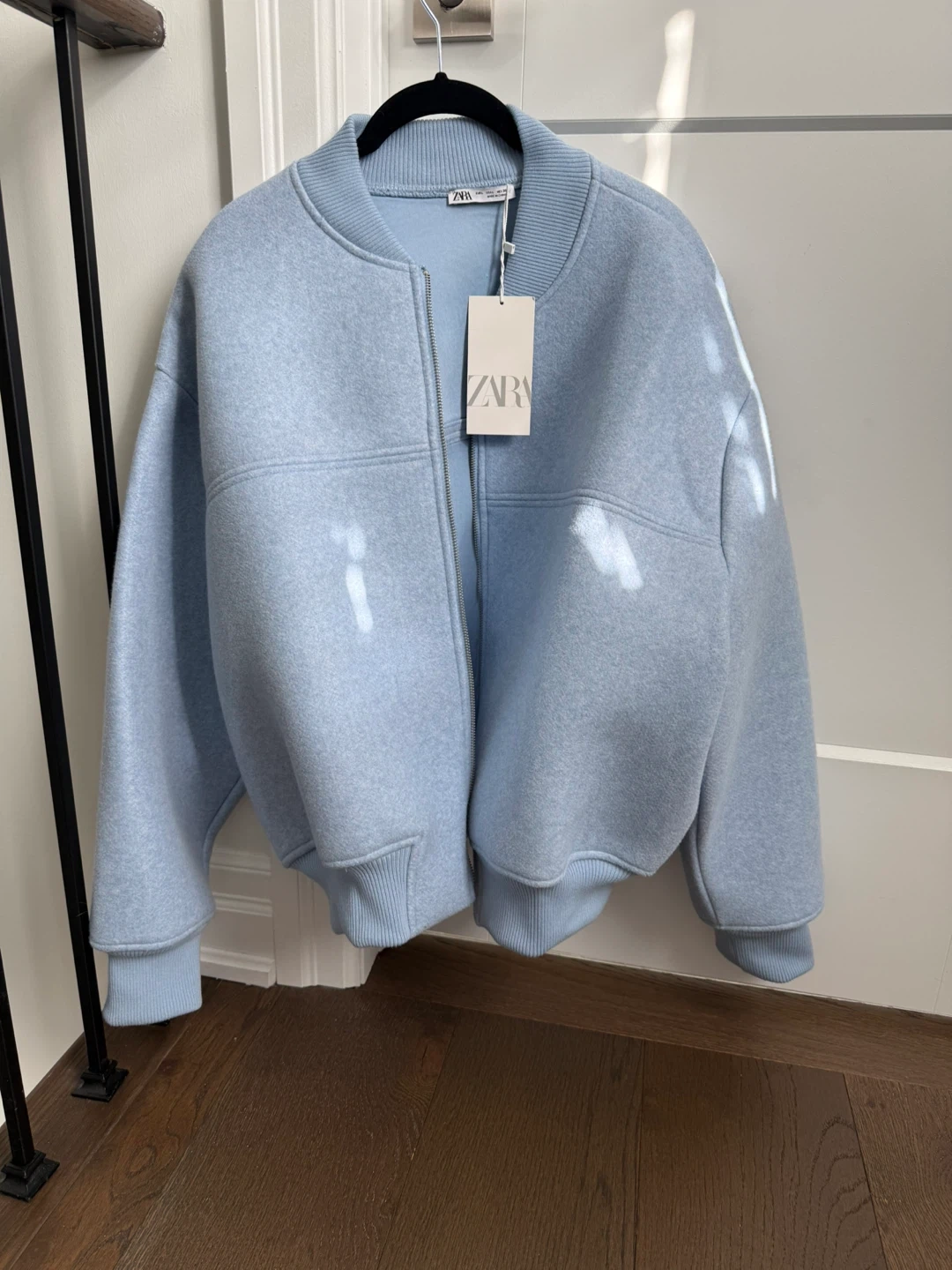 This is a Zara bomber jacket in a light blue colour. It's a size L and has a zip-up front with ribbed cuffs and hem. Made from a soft, brushed fabric.