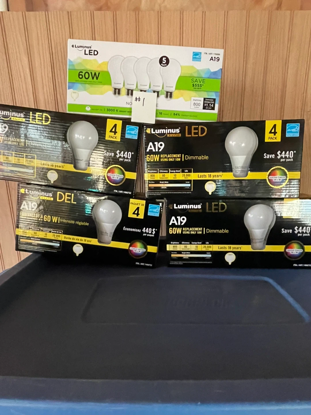 You're getting 4 brand new boxes (4 bulbs in each) of Luminus A19 LED light bulbs. They're 60W equivalents but only use 10W. These bulbs are dimmable and last for 18 years!
