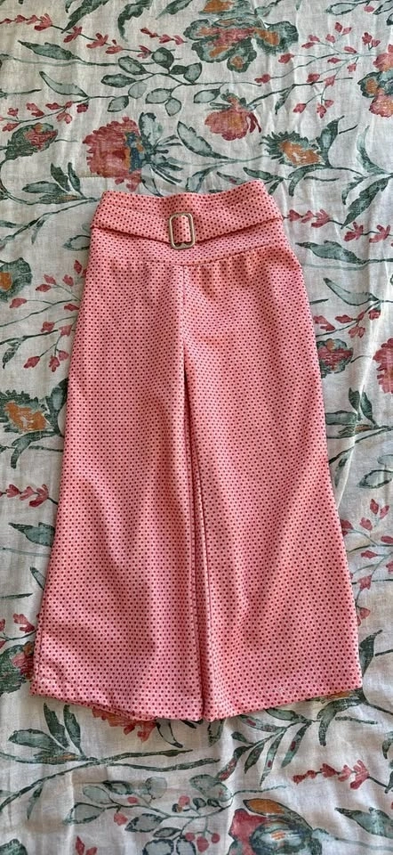 Comfy pink pants with a cute polka dot pattern. These are a wide leg style with a silver buckle on the waist. Size 4T.