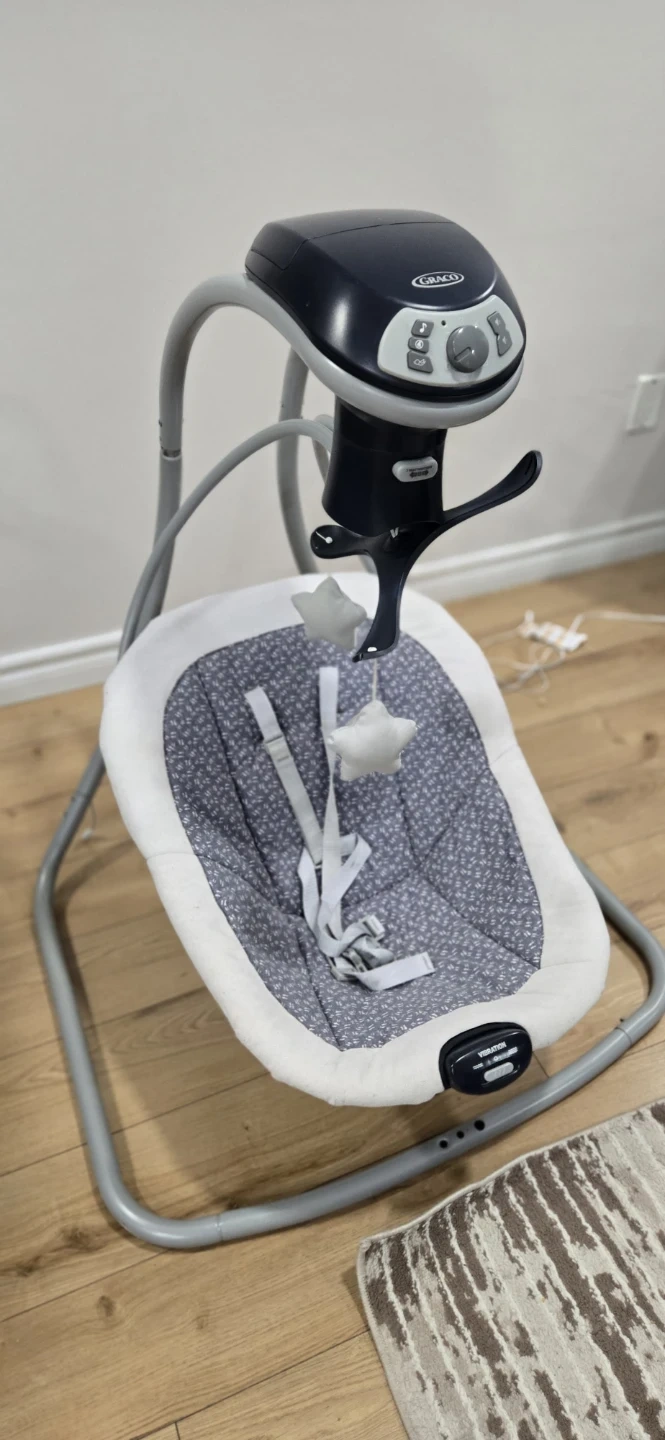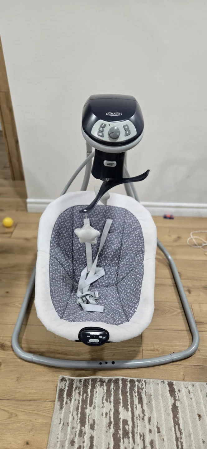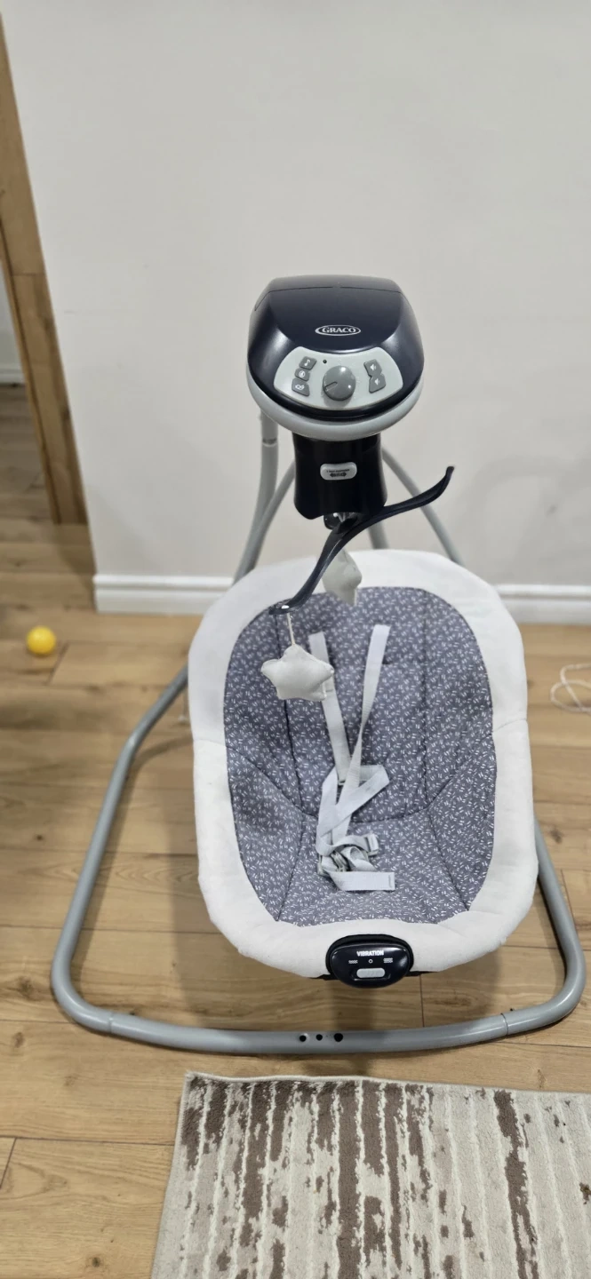 This Graco baby swing has multiple speed settings and soothing vibrations. It's designed with a comfortable seat and a secure harness. Great for keeping little ones content!