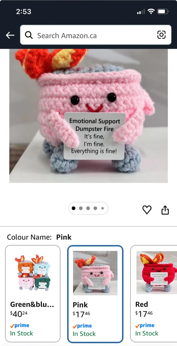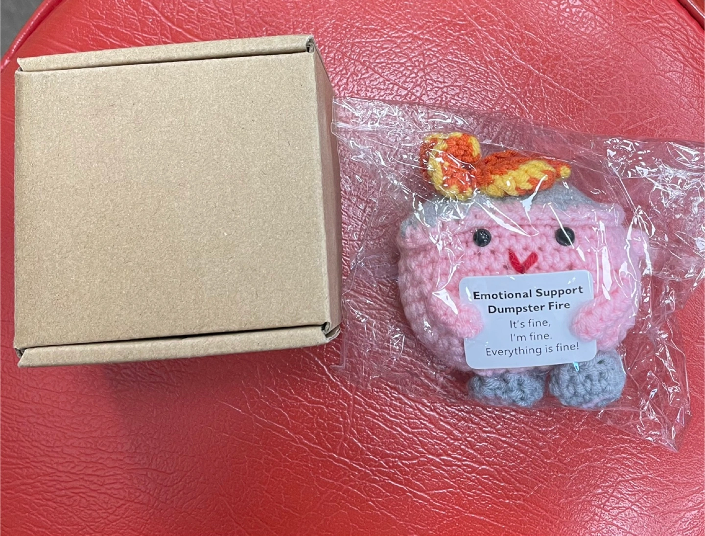 Hand-crocheted "Emotional Support Dumpster Fire" plushie. It's pink with a happy face and a sign that reads "It's fine, I'm fine, Everything is fine!". Includes a small cardboard box. Fun desk or room decor!