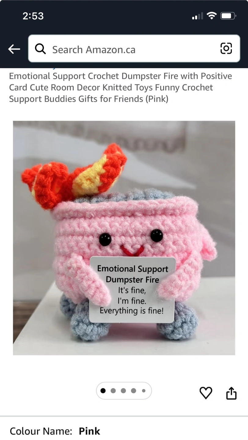 Hand-crocheted "Emotional Support Dumpster Fire" plushie. It's pink with a happy face and a sign that reads "It's fine, I'm fine, Everything is fine!". Includes a small cardboard box. Fun desk or room decor!