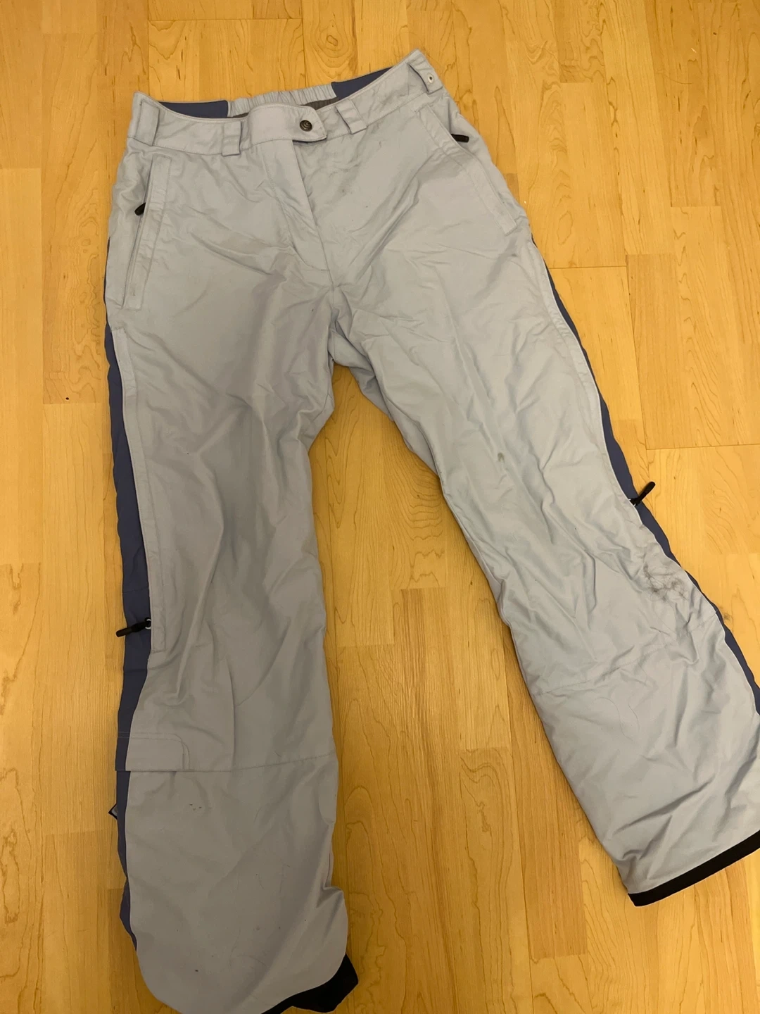 These light blue ski pants offer warmth and protection. They feature a durable outer shell and comfortable lining. Zippered pockets keep your essentials secure.