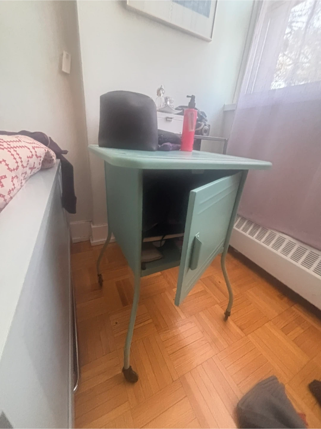 This is a neat vintage side table with a mint green metal finish. It's got a convenient cabinet for storage and sits on four wheels. The curved legs give it a unique retro look!