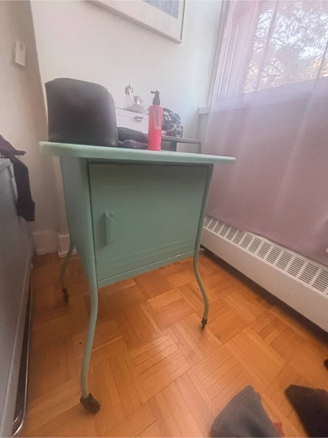 This is a neat vintage side table with a mint green metal finish. It's got a convenient cabinet for storage and sits on four wheels. The curved legs give it a unique retro look!