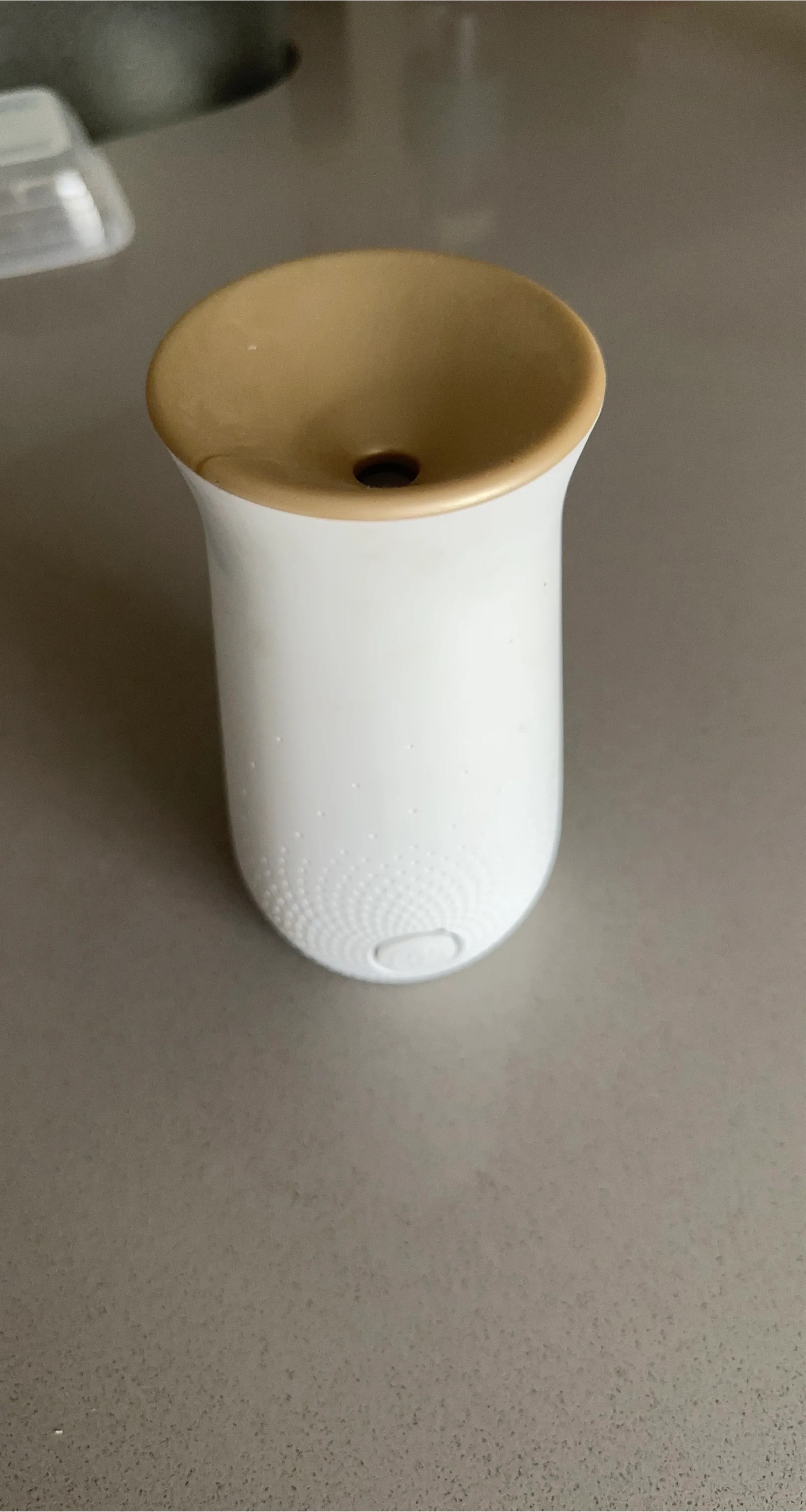 This ultrasonic essential oil diffuser is white with a tan top. It has a button at the base for operation. It's great for creating a relaxing atmosphere.