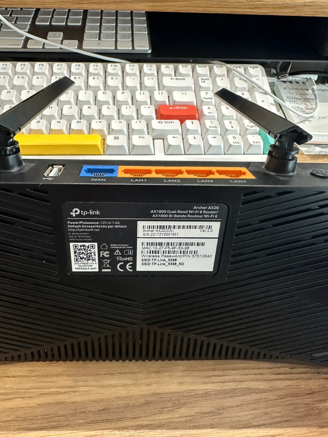 Moved to new place and ISP provided equipment. Selling my TP-Link Archer AX20 AX1800 Dual-Band Wi-Fi 6 Router. It's a dual-band router that supports Wi-Fi 6 technology. The router has four external antennas and comes with a power adapter and ethernet.
