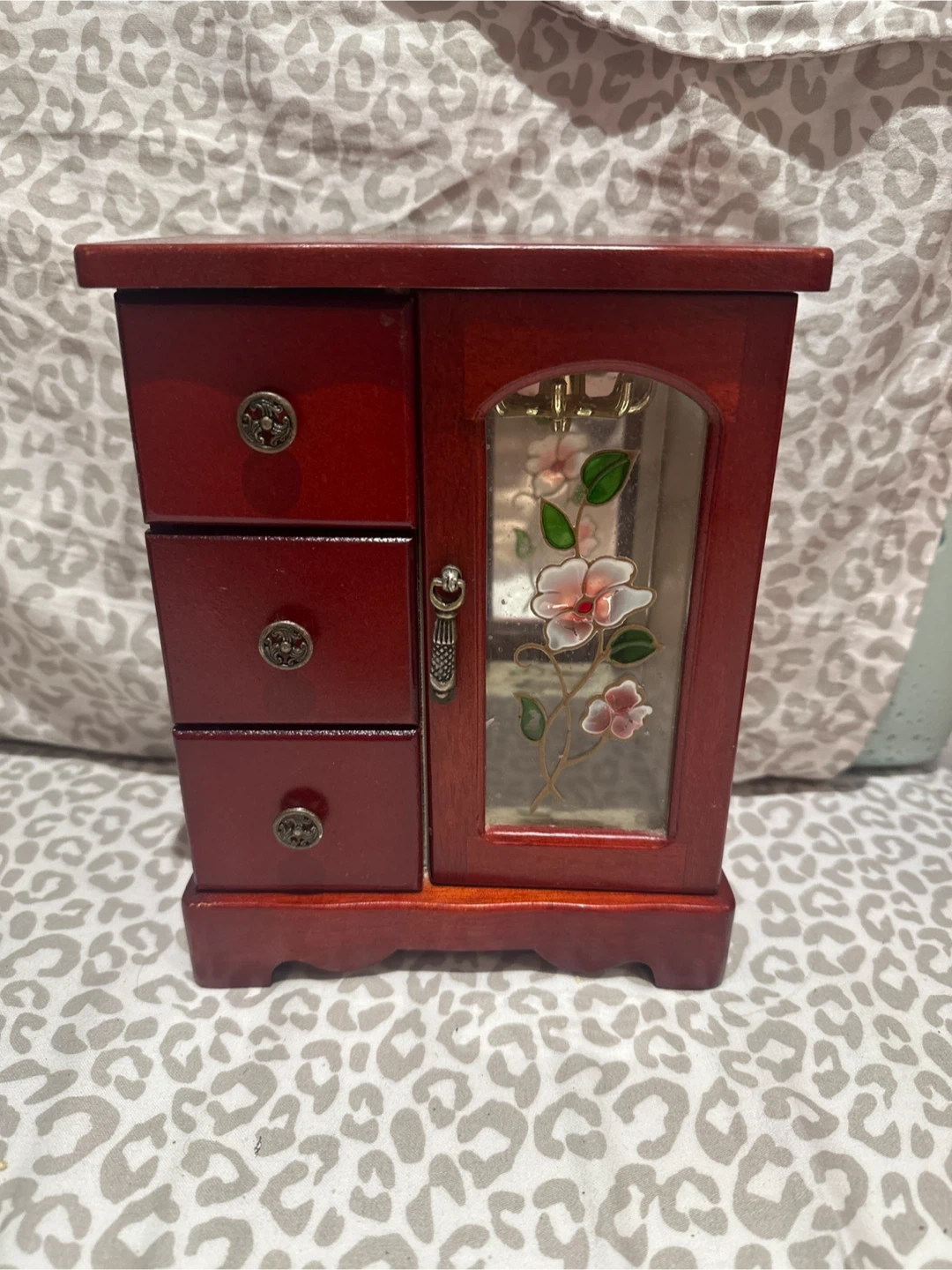 This is a lovely dark red wooden jewellery box. It features three small drawers on the left side and a cabinet with a glass door on the right. The cabinet has a hanger inside for necklaces or bracelets. The glass door is decorated with a painted floral design. It's great for organizing your precious accessories!