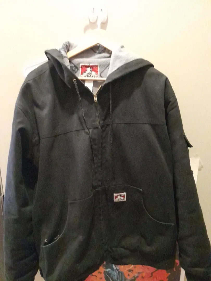 Black Ben Davis hooded work jacket. It's a durable and functional piece for outdoor work. Shell is cotton blend, lining is polyester.