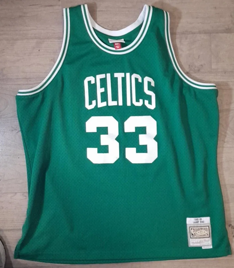 This is a Mitchell & Ness Hardwood Classics Boston Celtics Larry Bird jersey. It's a size XXL in green. Features the iconic Celtics logo and number 33.