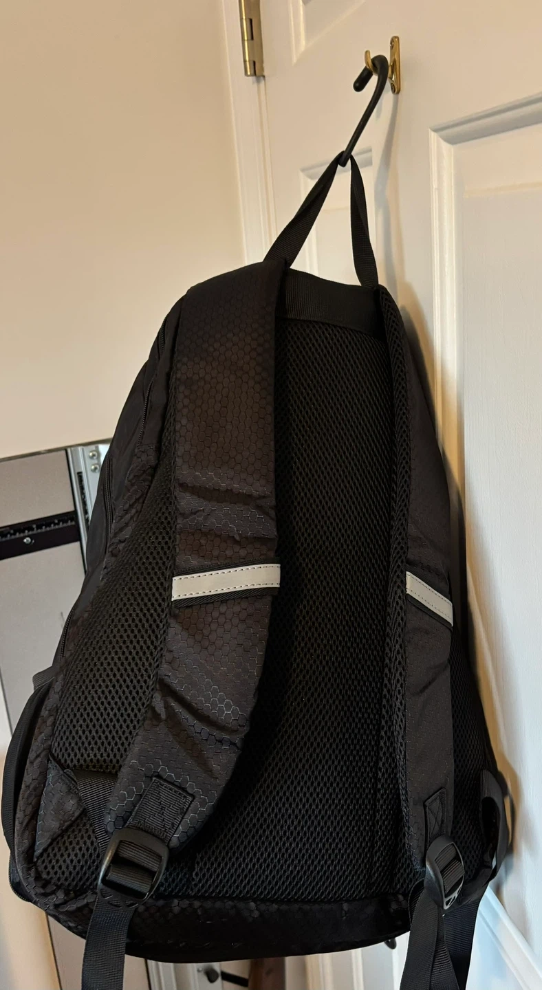 This is an Arcoyard black backpack. It's made of nylon material and features adjustable shoulder straps. It has a main zippered compartment with a front zippered pocket and elastic bungee cords for extra storage. Perfect for everyday use or travel!