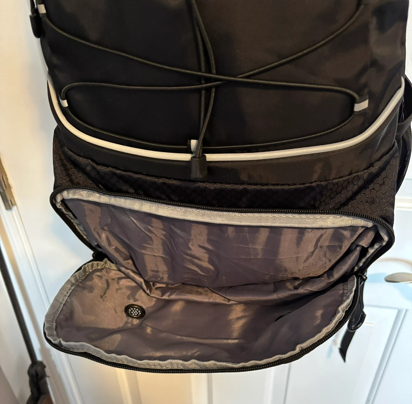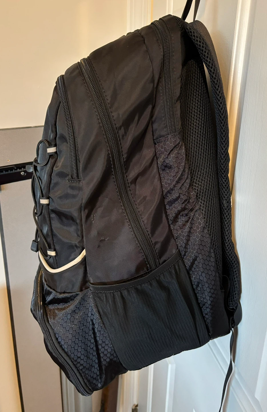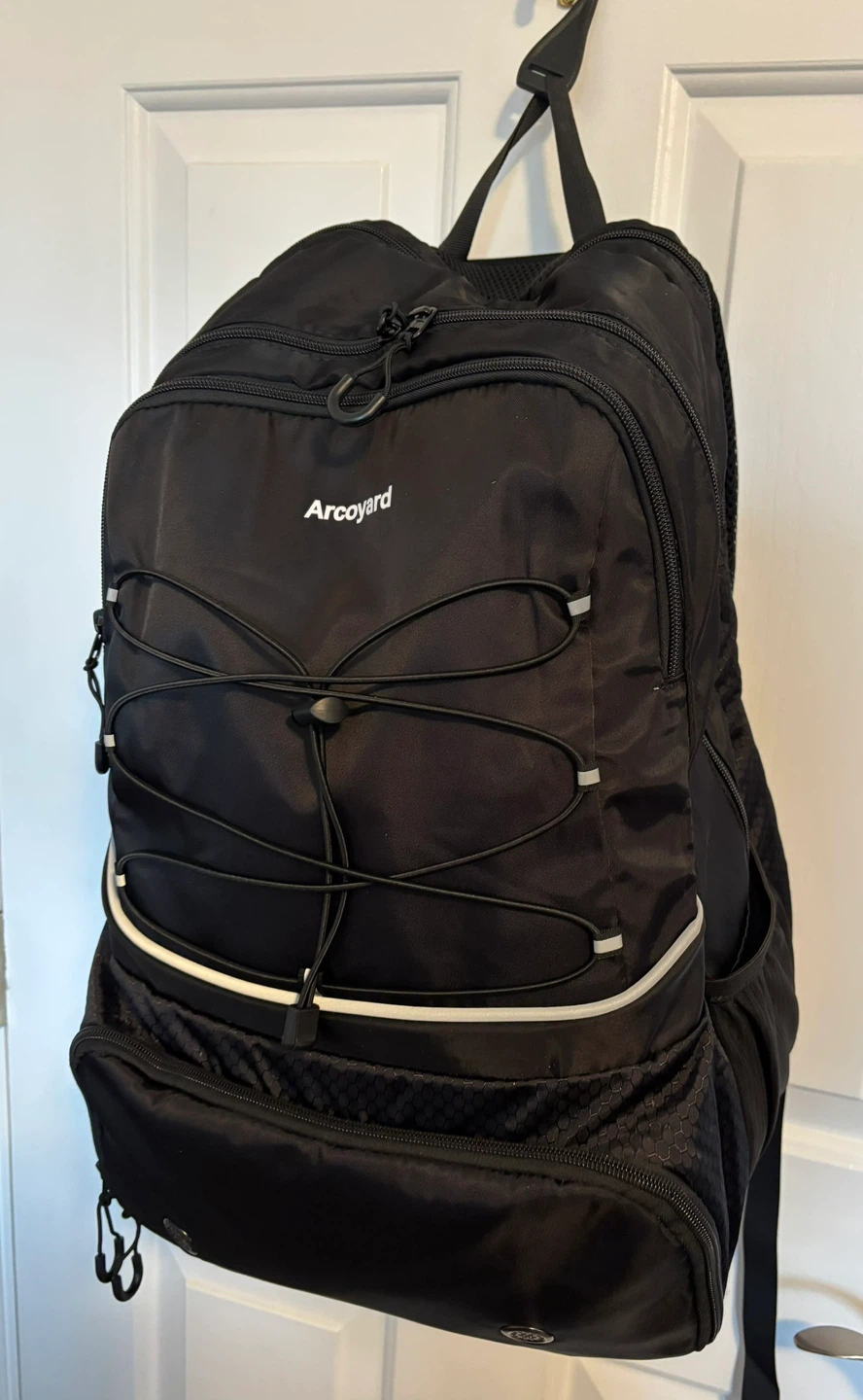 This is an Arcoyard black backpack. It's made of nylon material and features adjustable shoulder straps. It has a main zippered compartment with a front zippered pocket and elastic bungee cords for extra storage. Perfect for everyday use or travel!