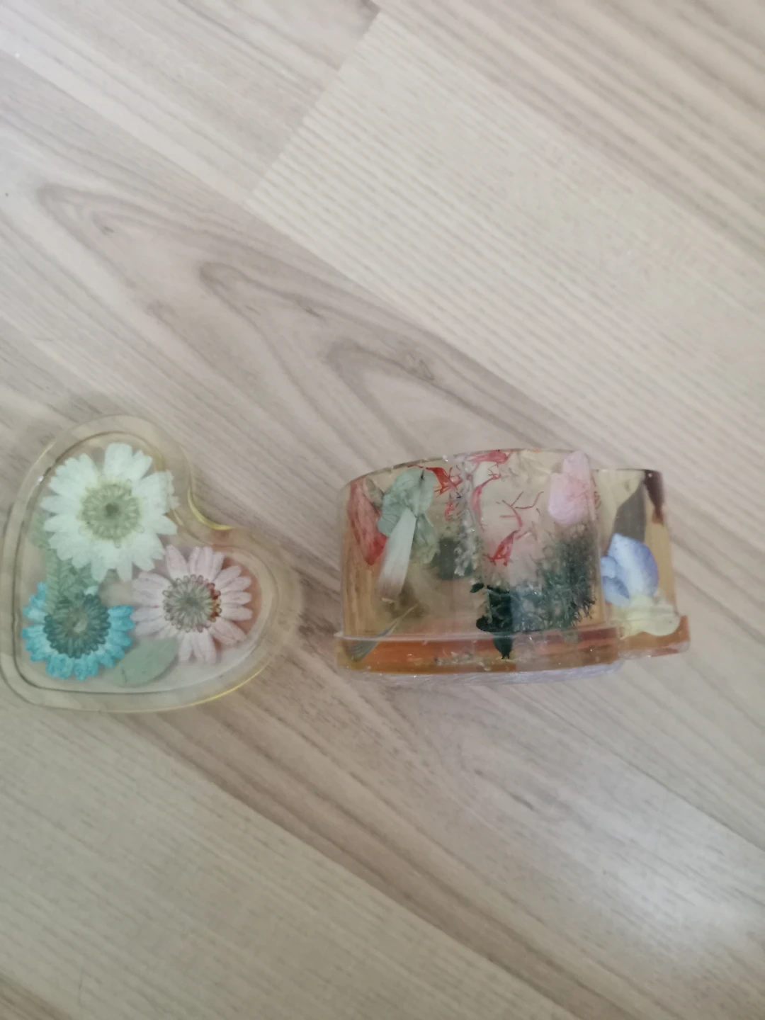 This cute heart-shaped trinket box is made with clear resin and features colourful dried flowers embedded inside. It's perfect for storing small jewellery or keepsakes. The lid fits snugly, keeping your treasures safe!