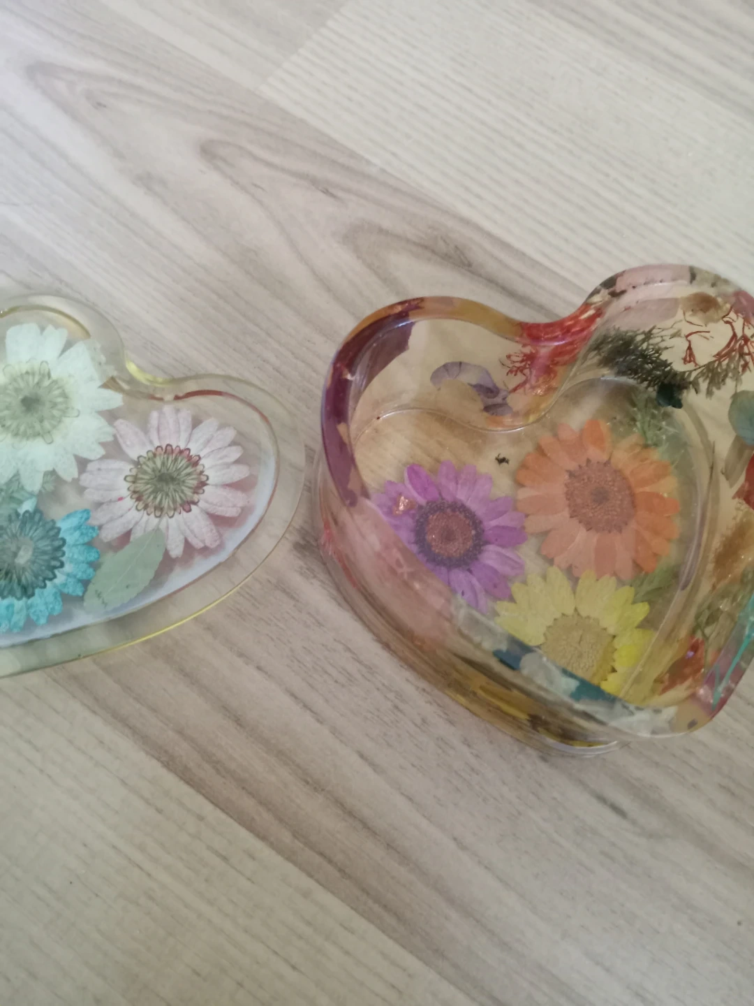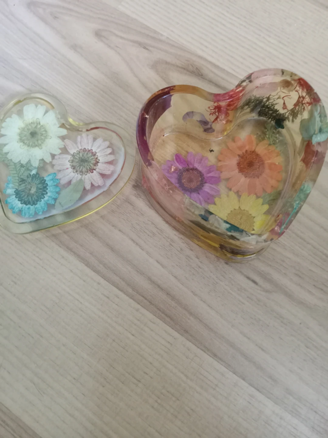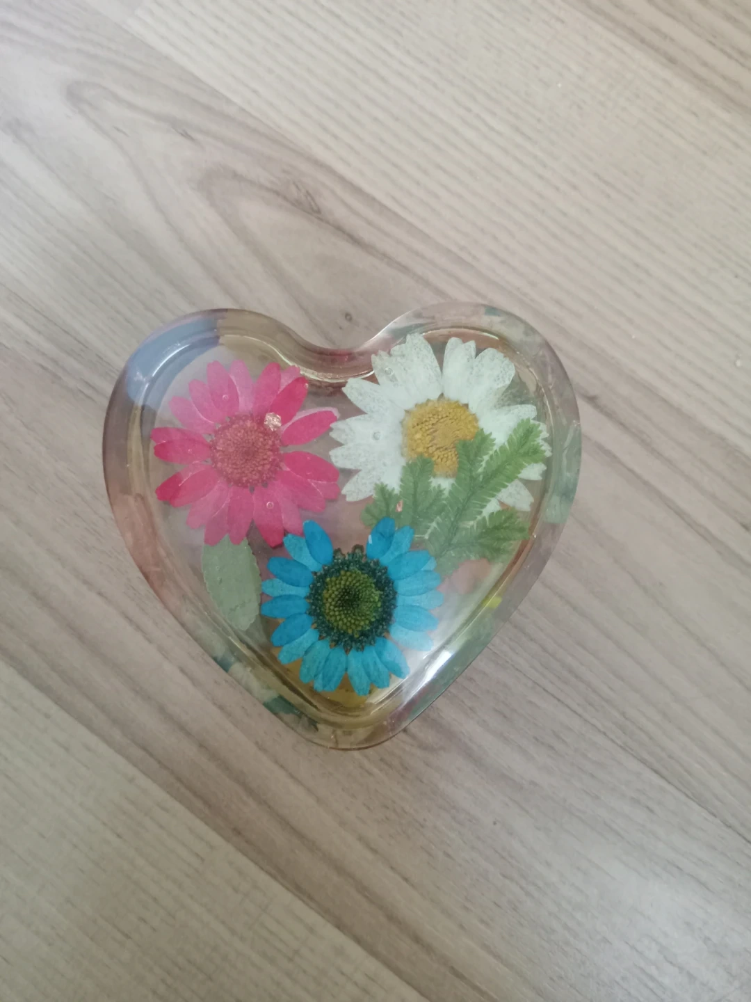 This cute heart-shaped trinket box is made with clear resin and features colourful dried flowers embedded inside. It's perfect for storing small jewellery or keepsakes. The lid fits snugly, keeping your treasures safe!