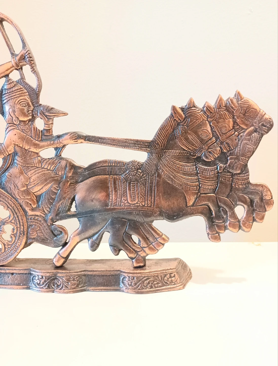 A unique metal Sculpture depicting Lord Krishna and Arjuna in a chariot, a scene from the Hindu epic Mahabharata.