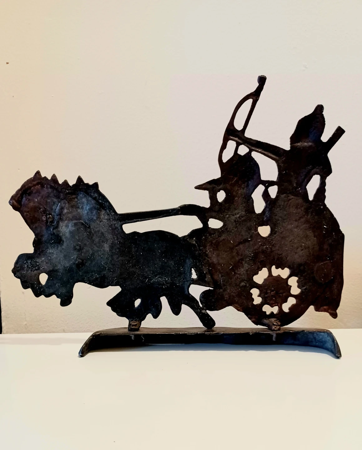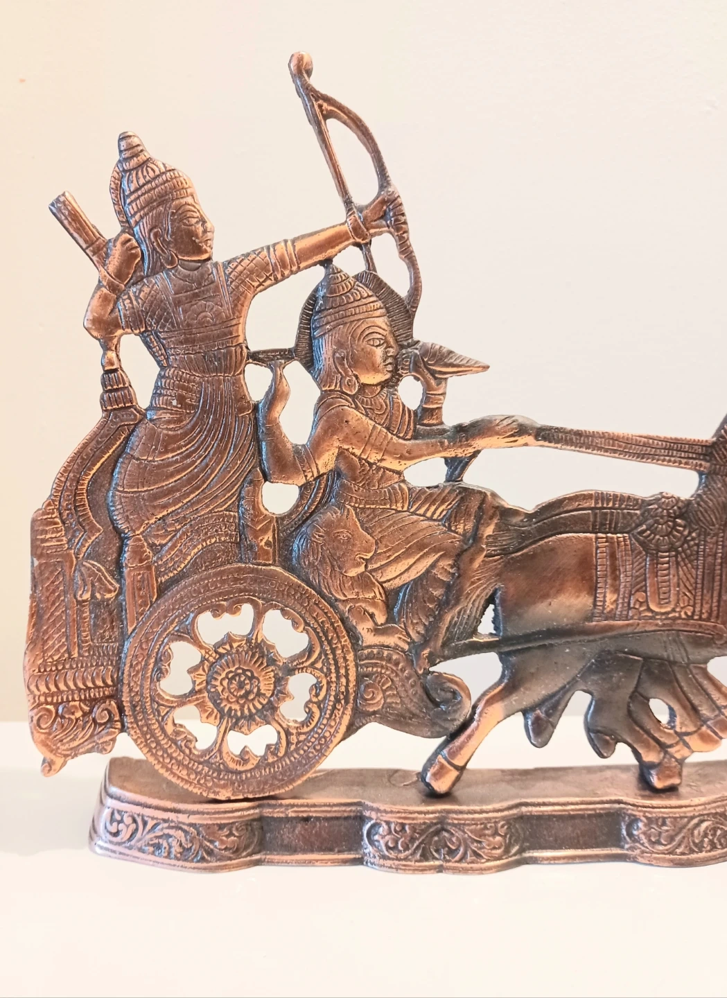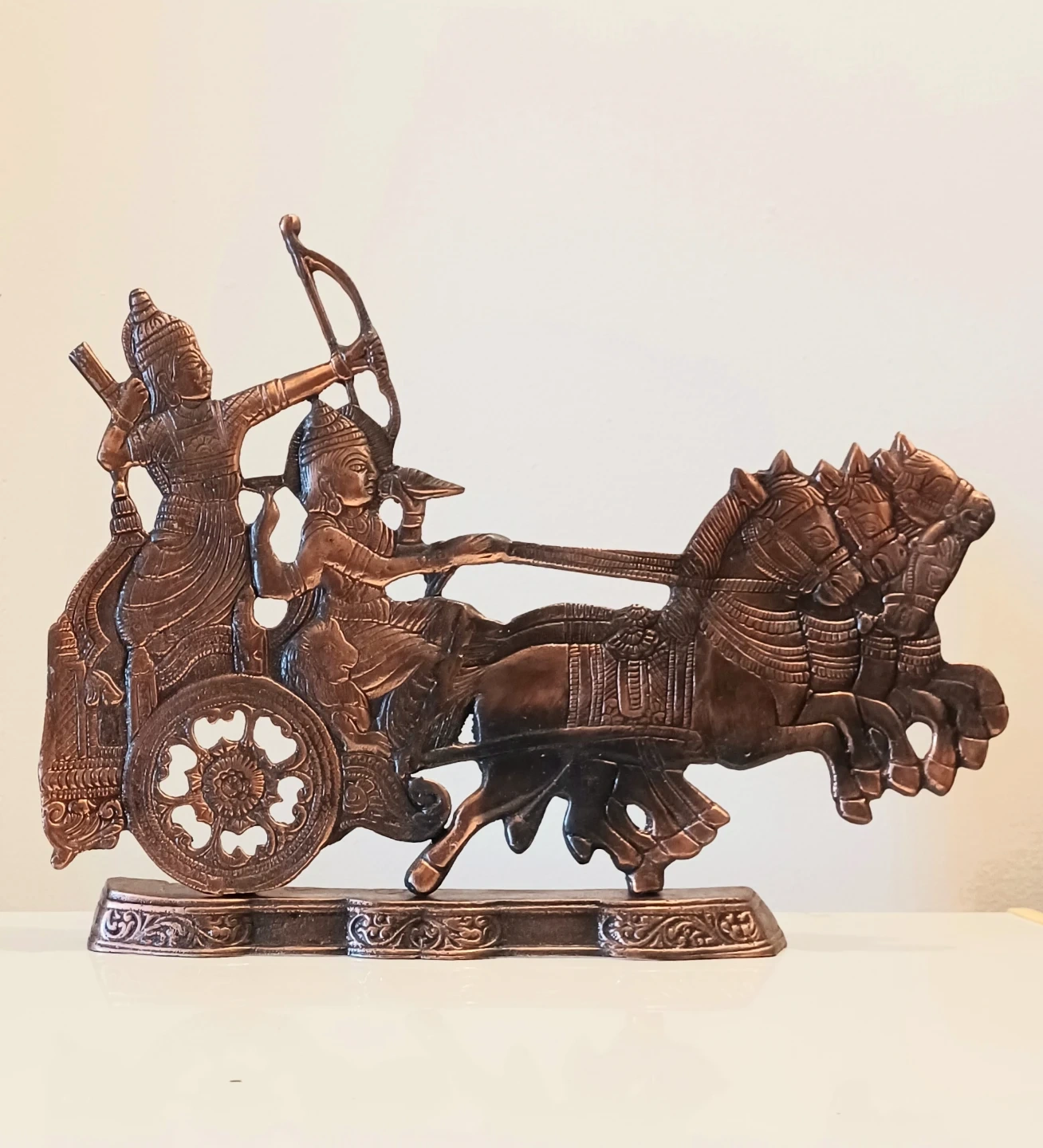A unique metal Sculpture depicting Lord Krishna and Arjuna in a chariot, a scene from the Hindu epic Mahabharata.