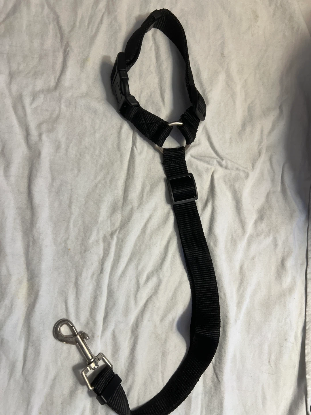 This is a black adjustable dog car seat belt leash. It's made of durable nylon webbing with a metal clasp and buckle. The leash is designed to keep your dog safely secured in the car.
