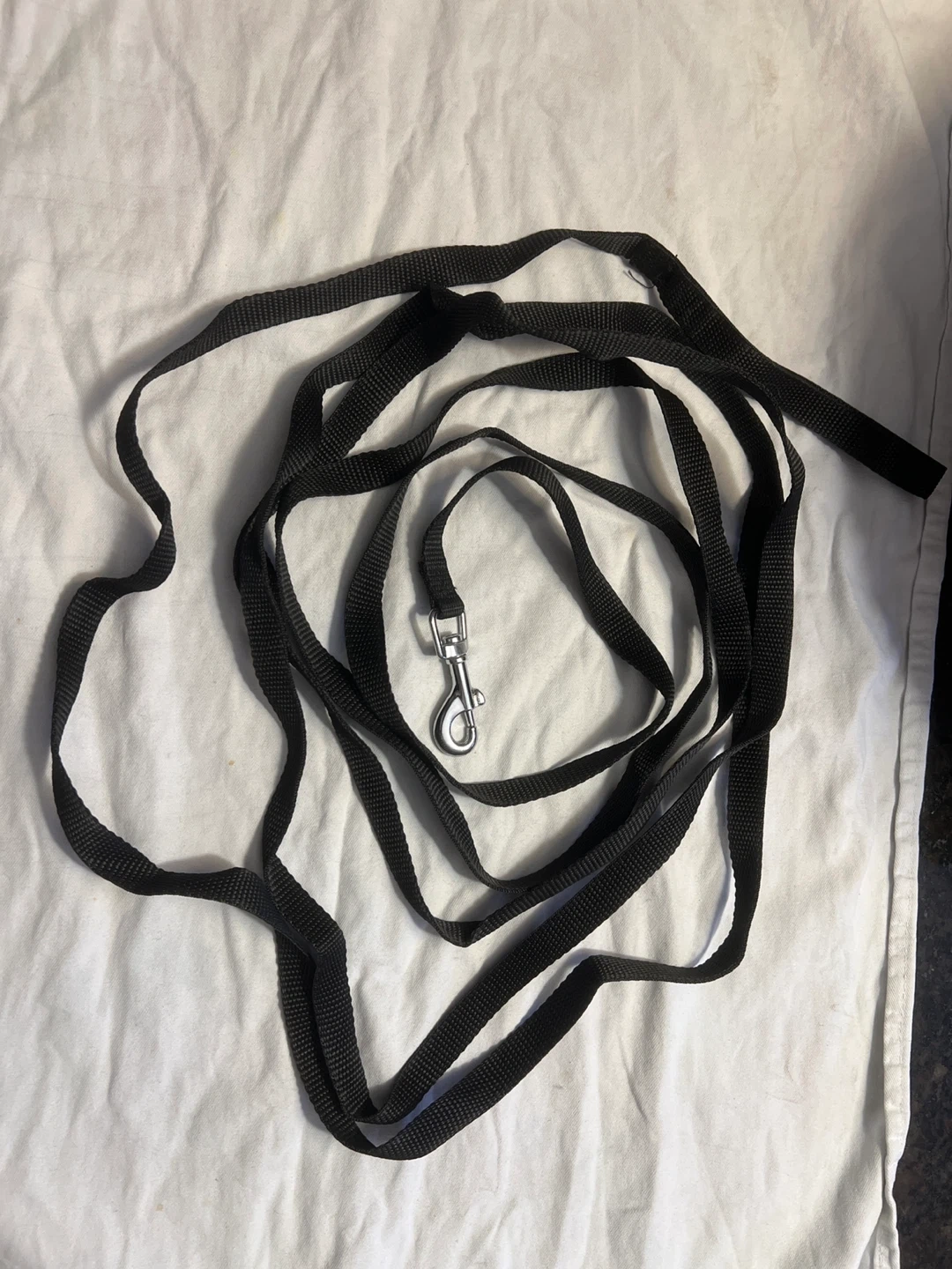 This is a standard black nylon dog leash. It features a sturdy silver metal clasp for secure attachment. The nylon material is durable and easy to clean. It's suitable for everyday walks with your pet.Very long about 10 ft.