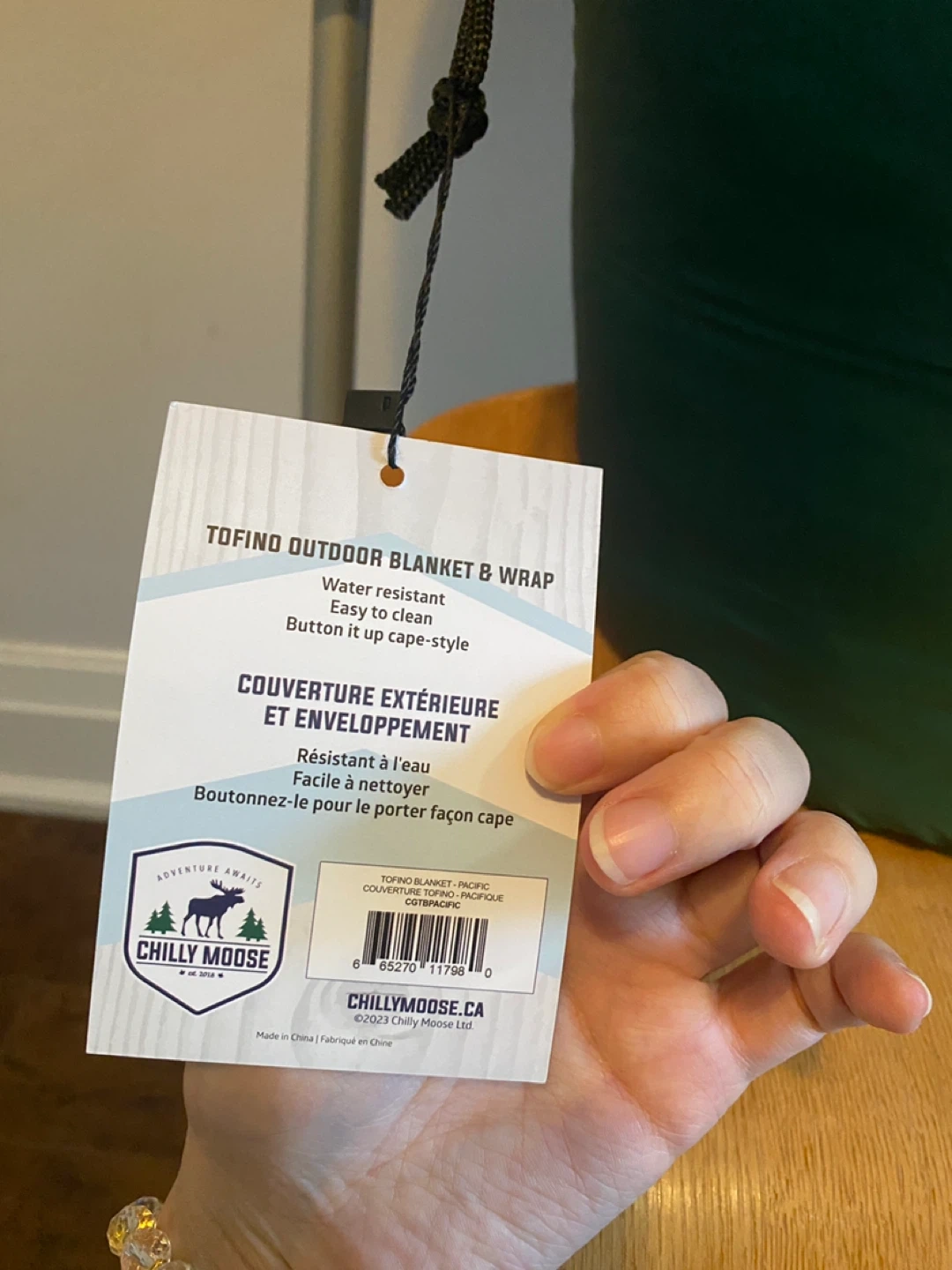 This Chilly Moose Tofino blanket and wrap is water resistant and easy to clean. It features a button-up cape-style closure. Made with 100% Virgin Polyester, its unpacked dimensions are 55" x 78" (140cm x 200cm). This is great for outdoor adventures!