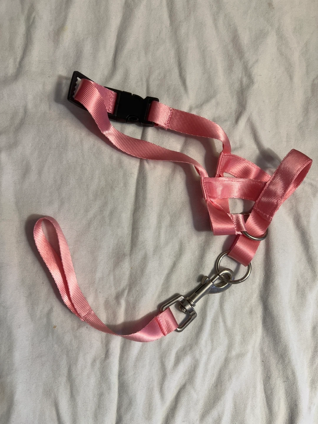 A pink nylon leash for pets. It has a quick-release buckle and a swivel clasp for secure attachment. Material is nylon. Gentle leader style