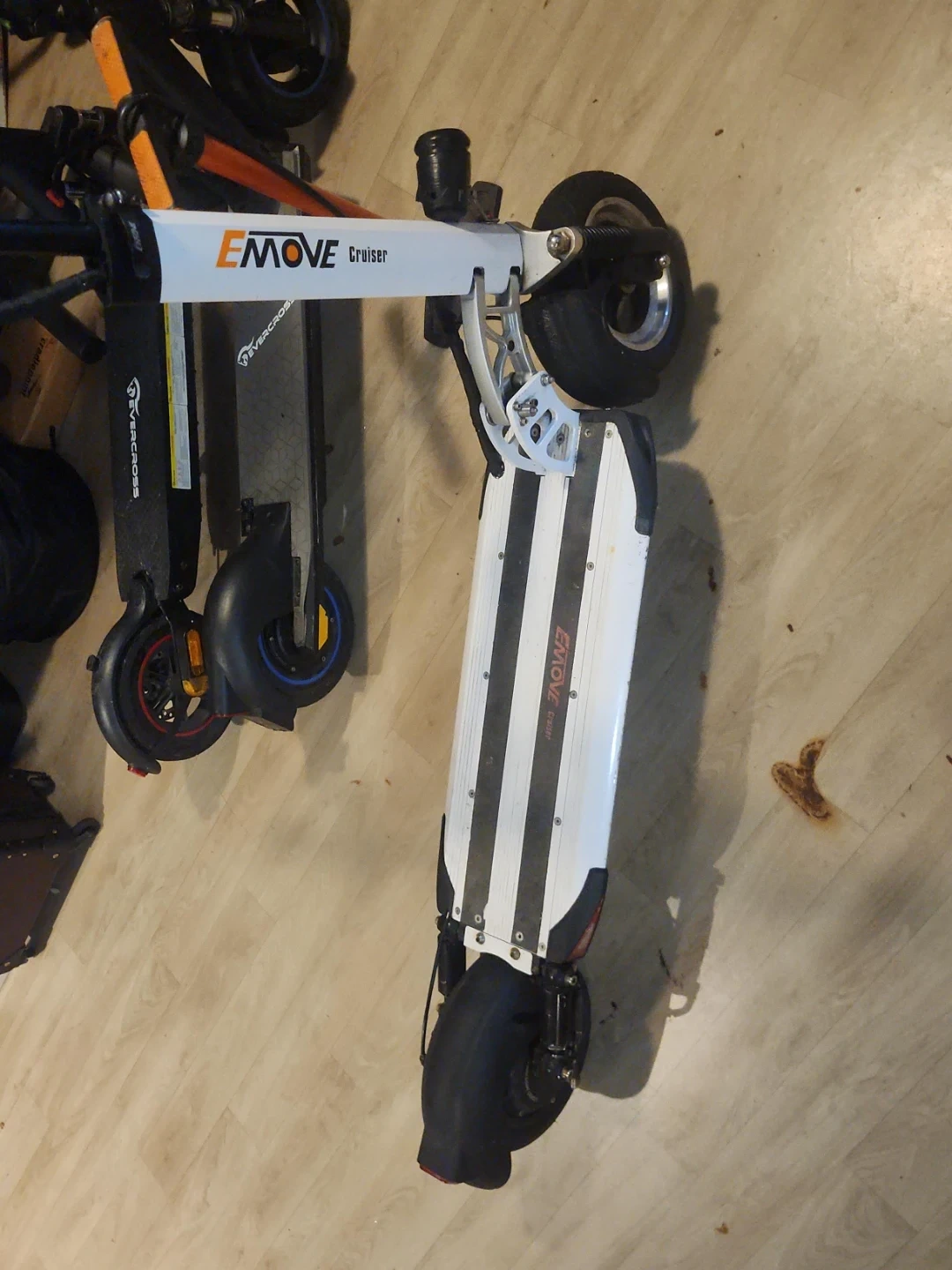 This is an EMOVE Cruiser electric scooter. It's white with black stripes on the deck. Features pneumatic tires for a smoother ride. Great for commuting or recreational use!