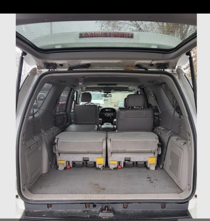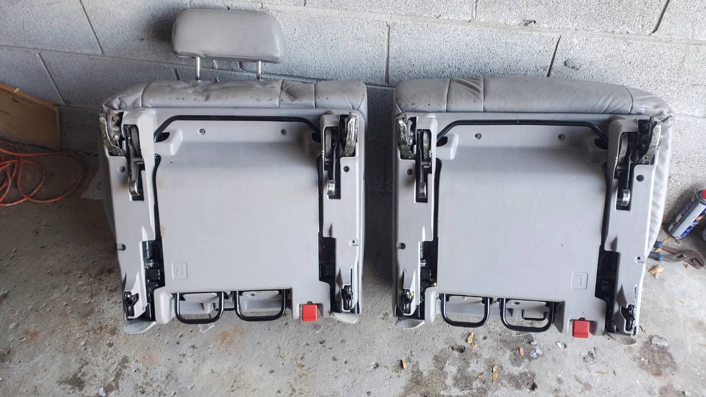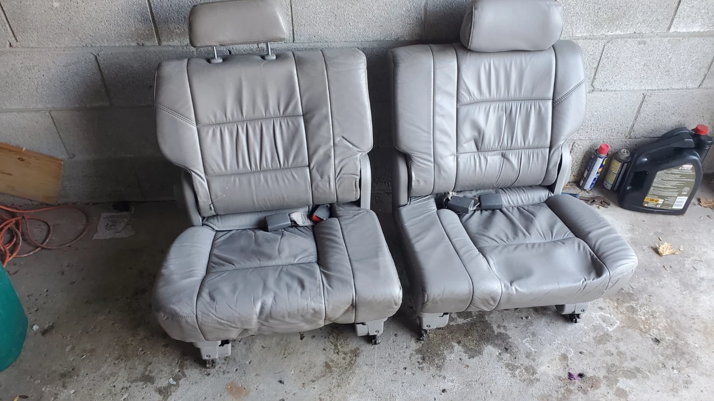 Selling a set of two used car seats. They are grey leather and appear to be from an SUV. Includes headrests and seatbelts. The seats look like they fold down for storage.