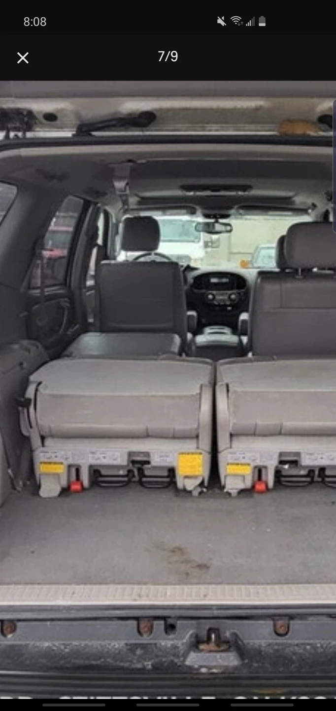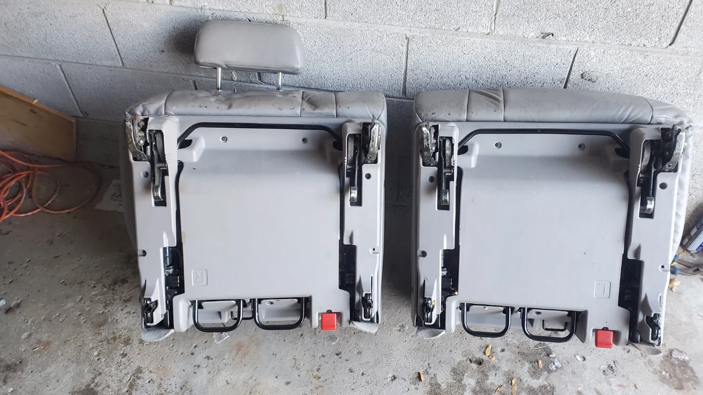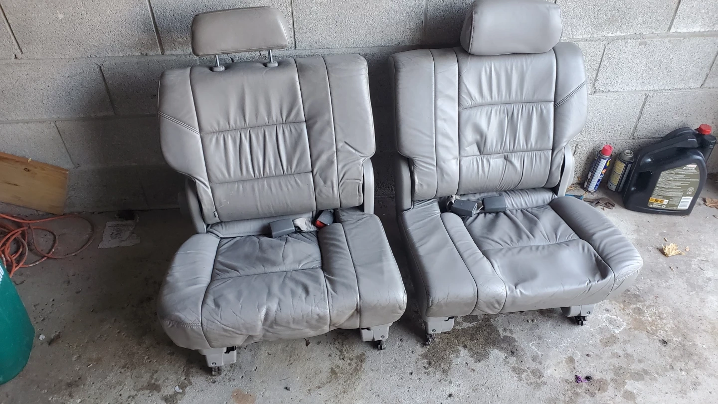 Selling a set of two used car seats. They are grey leather and appear to be from an SUV. Includes headrests and seatbelts. The seats look like they fold down for storage.