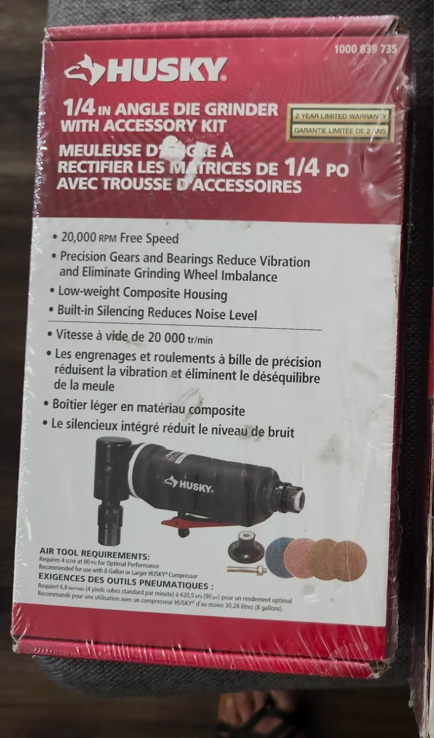This Husky 1/4 inch angle die grinder comes with an accessory kit. It features 20,000 RPM free speed and a low-weight composite housing. Precision gears and bearings reduce vibration and noise for a smoother operation.