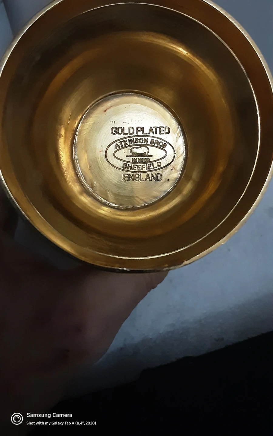 This is a gold-plated goblet made by Atkinson Bros in Sheffield, England. It features an intricate etched floral design around the body. It's a decorative piece, perfect for display.