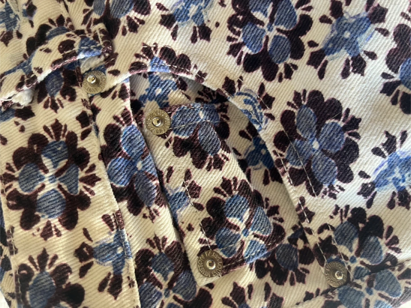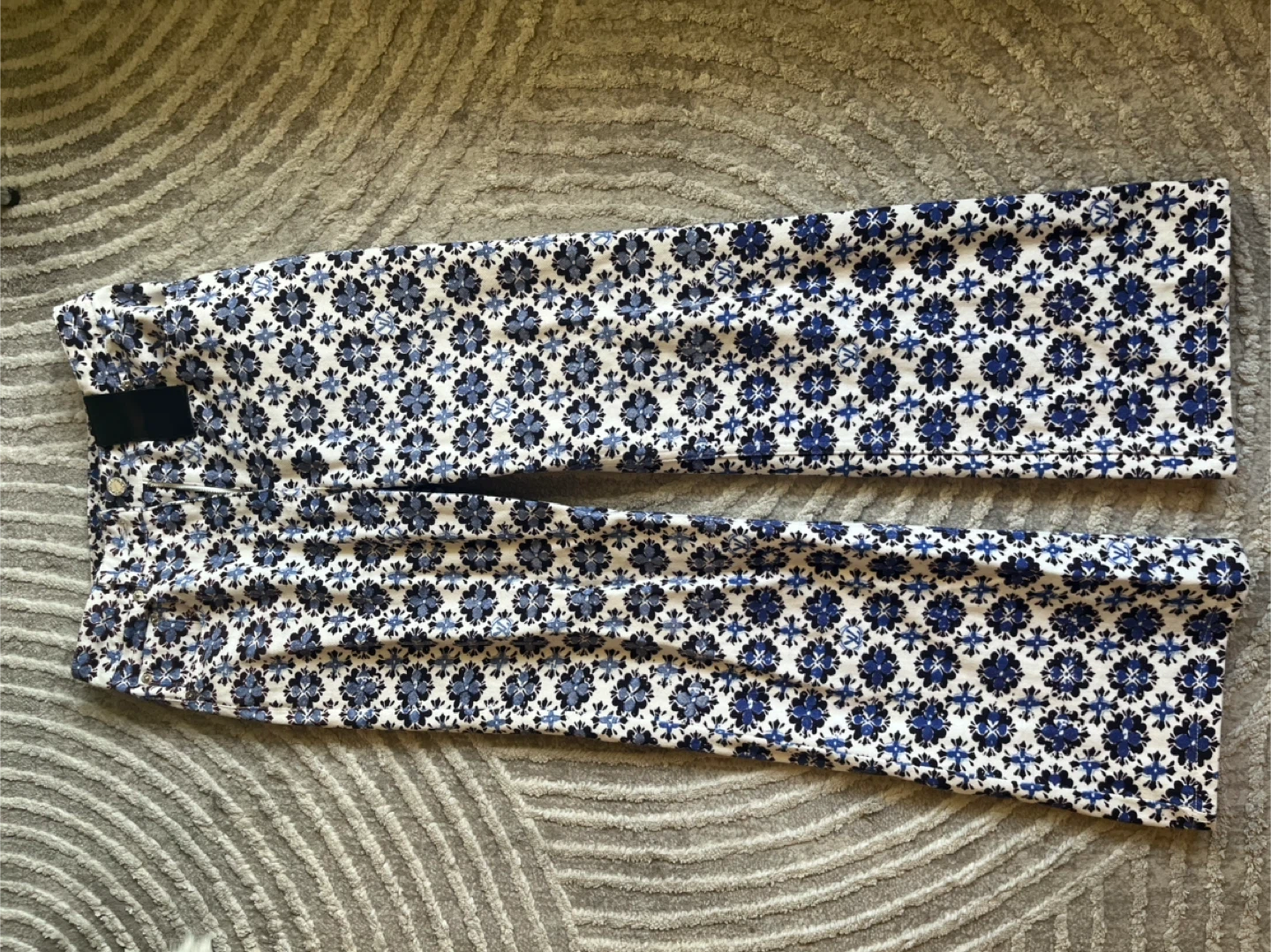 These pants feature a white base with a vibrant floral print in blue and black. They're made from a comfortable material suitable for everyday wear. The distinctive pattern makes them a stylish addition to any wardrobe.