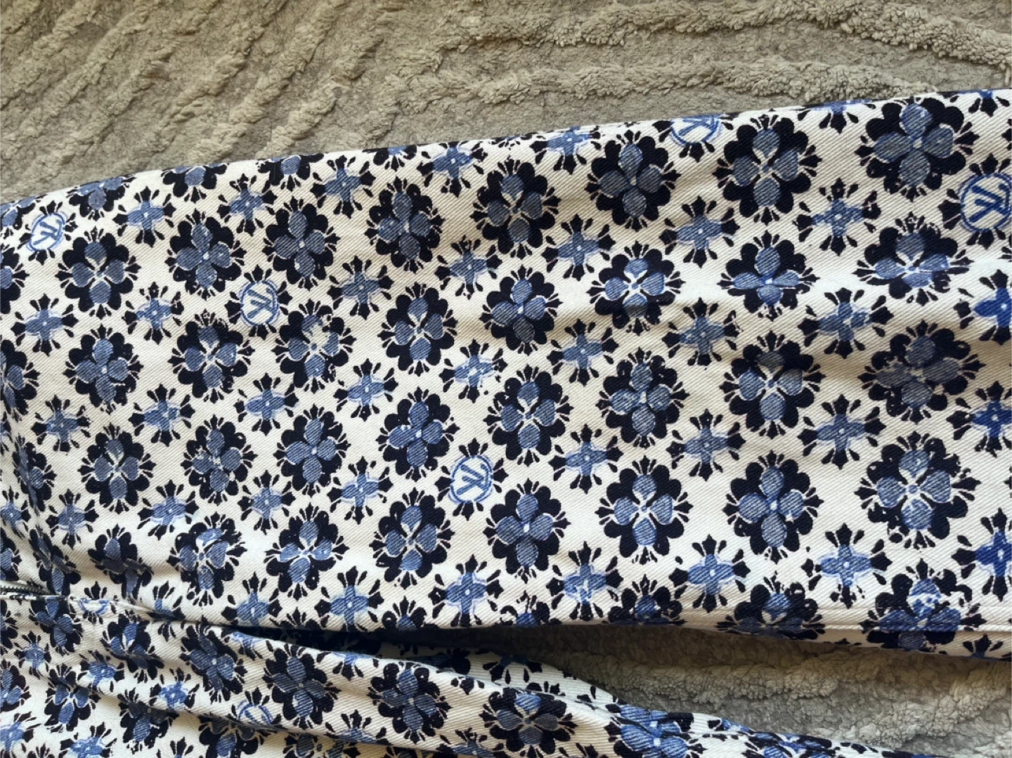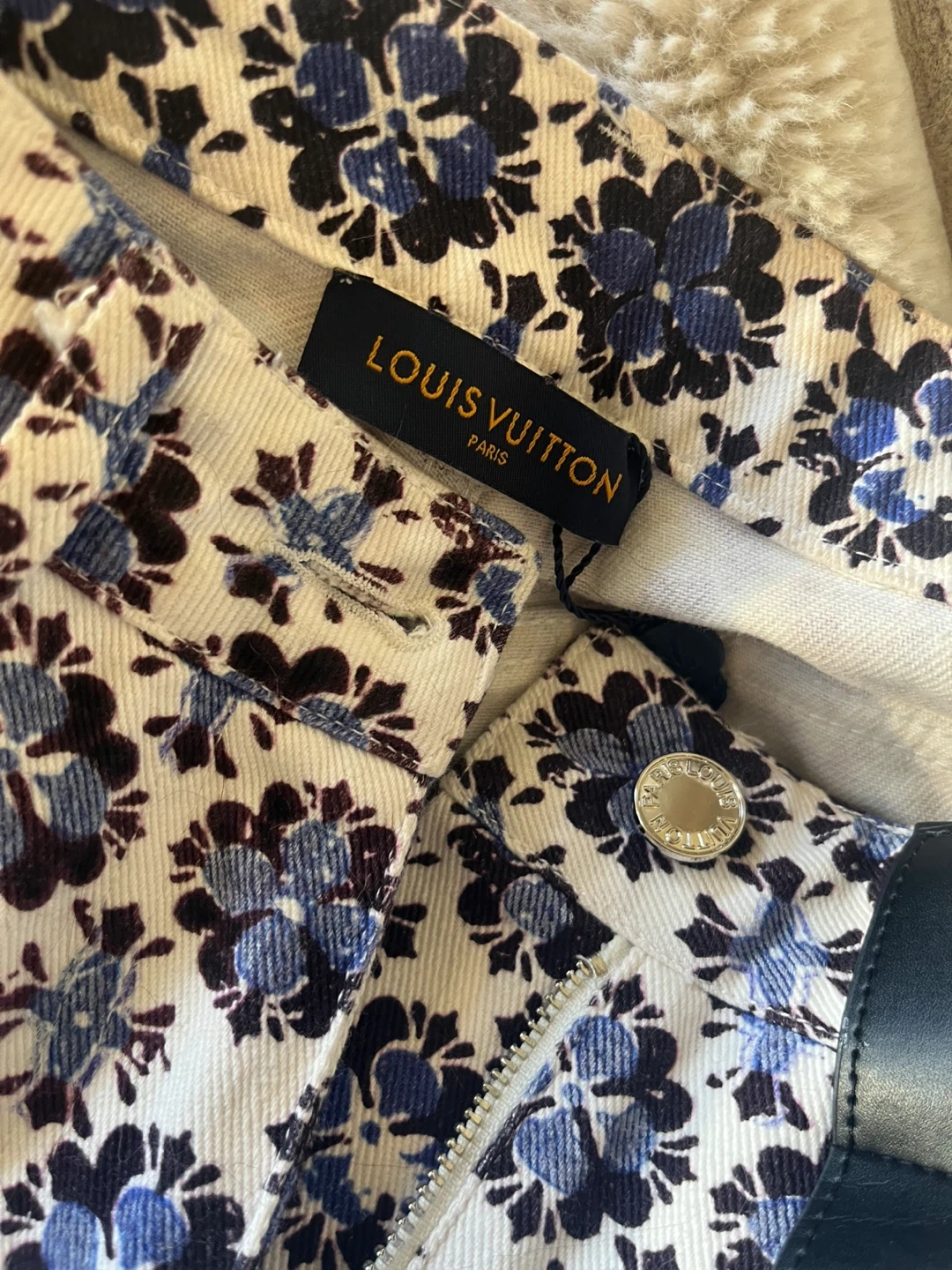 These pants feature a white base with a vibrant floral print in blue and black. They're made from a comfortable material suitable for everyday wear. The distinctive pattern makes them a stylish addition to any wardrobe.