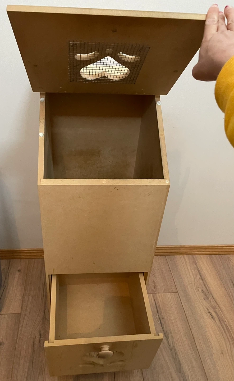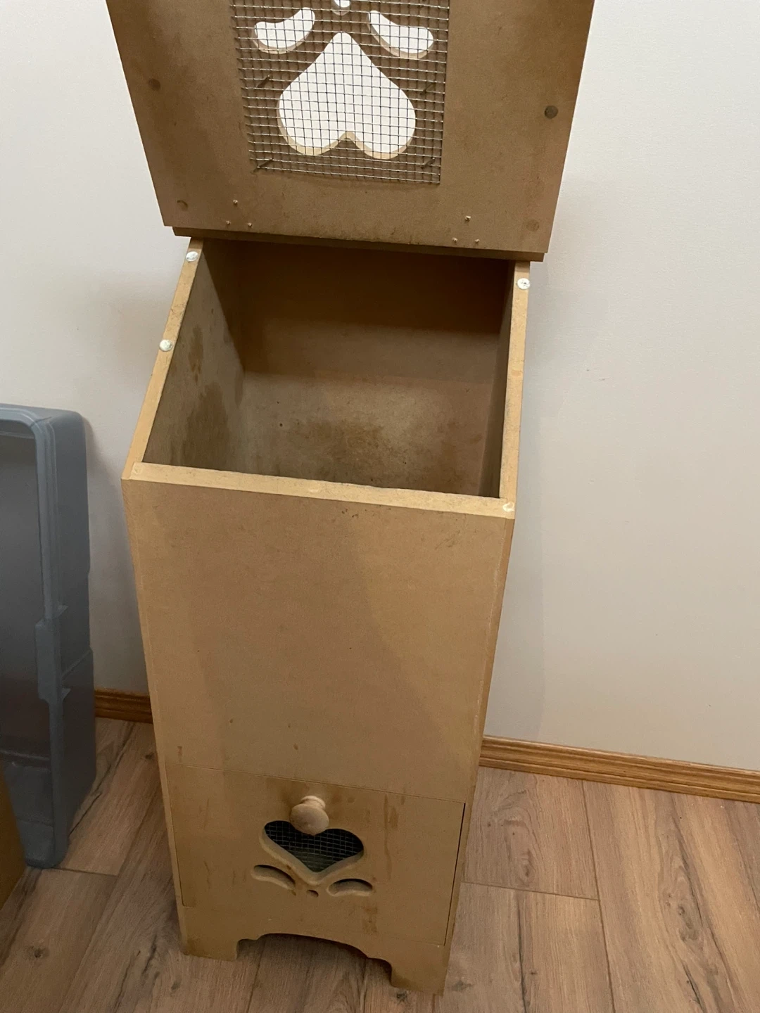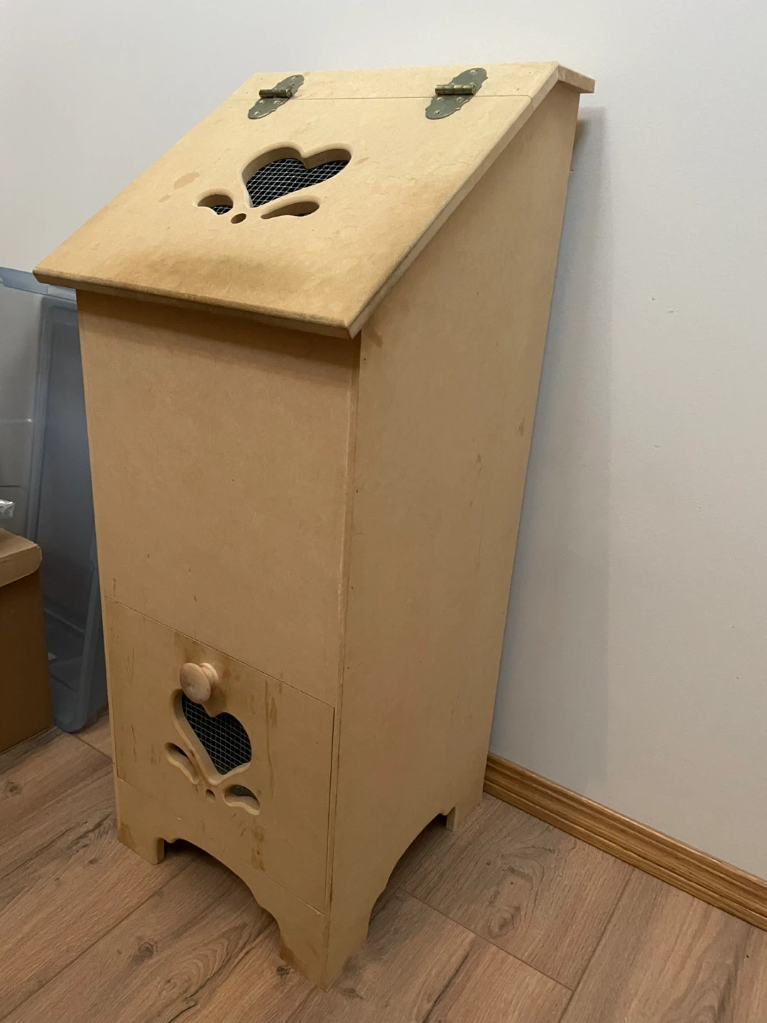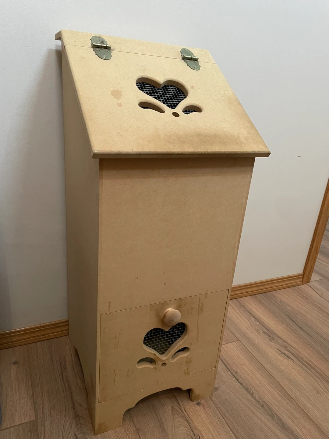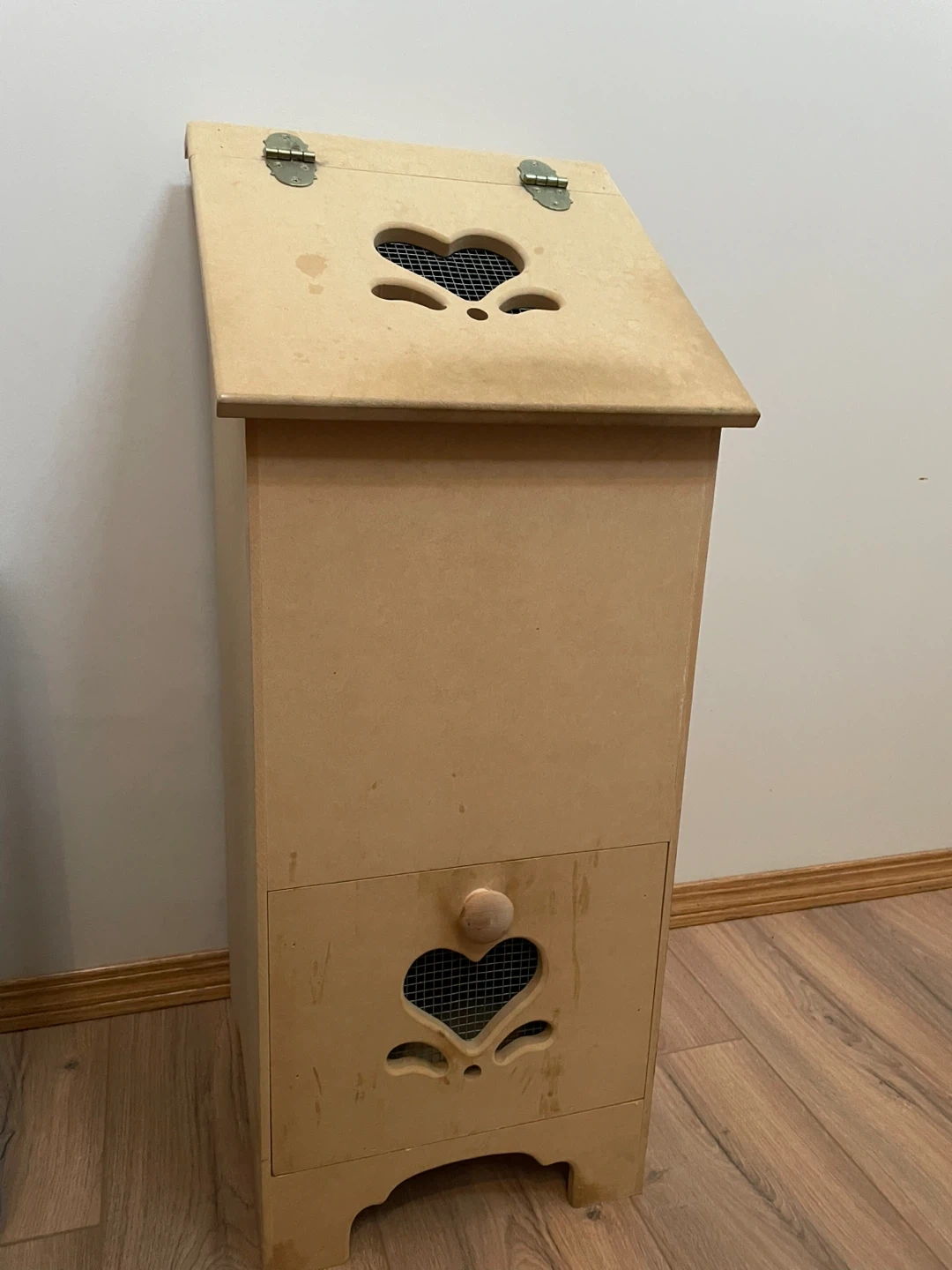 This is a wooden storage bin with a hinged lid and a pull-out drawer. It features a decorative heart-shaped cutout with mesh on the front and lid. Great for storing bathroom supplies, food or other household items!