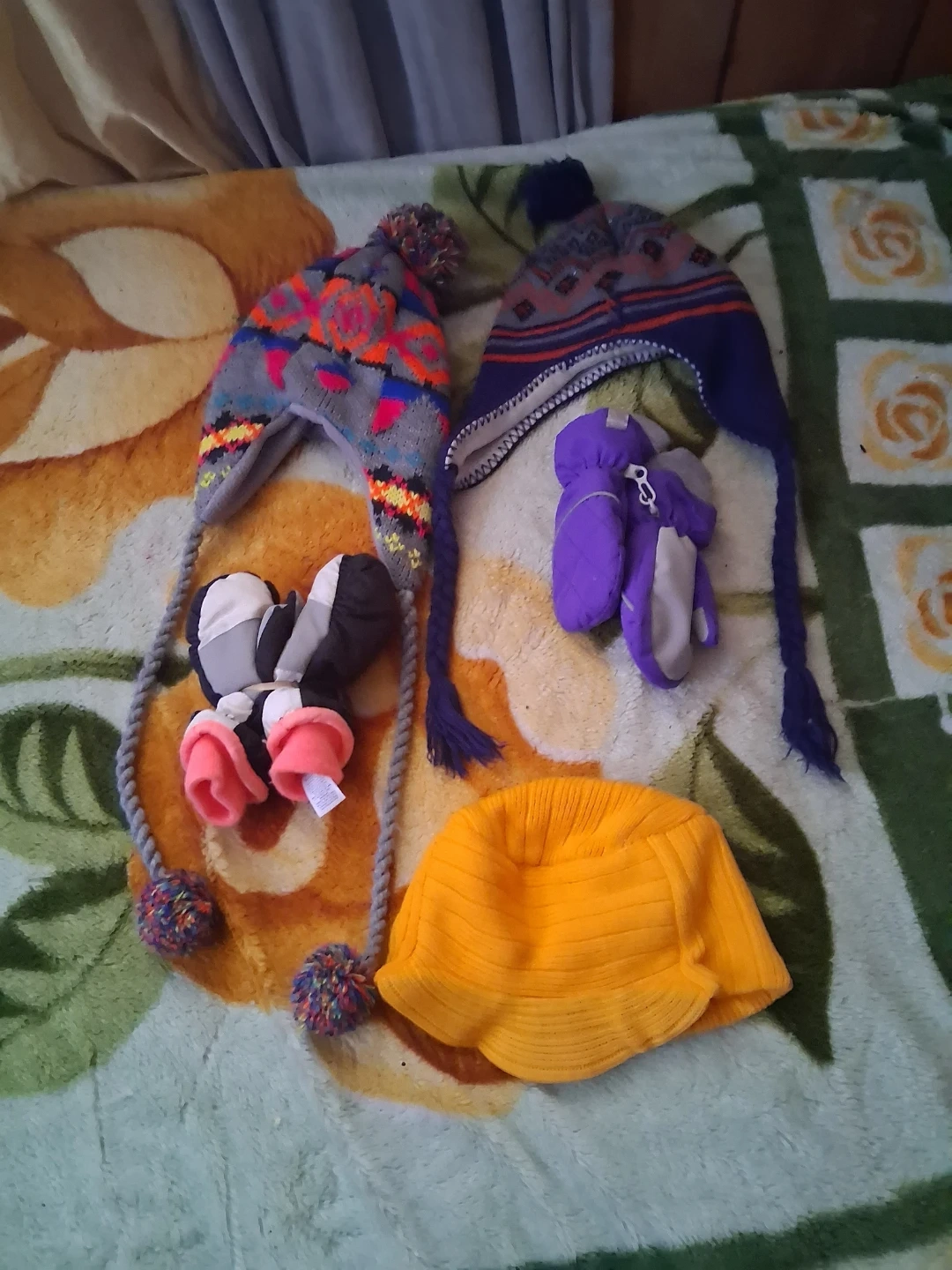 This set includes two knitted winter hats with ear flaps and pom-poms, along with two pairs of mittens. One hat is gray with colorful geometric patterns, and the other is blue with a diamond pattern. One pair of mittens is black and white with pink cuffs, and the other is purple. There's also a separate yellow ribbed hat with a brim. Great for keeping little ones warm!