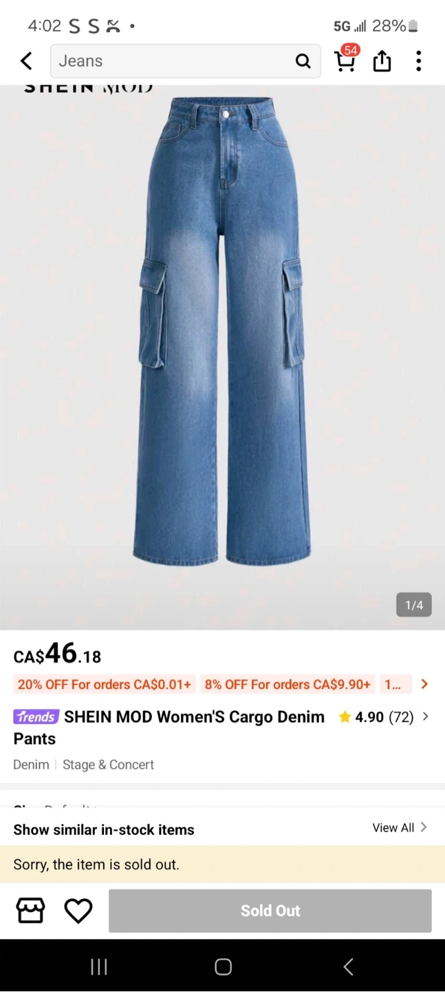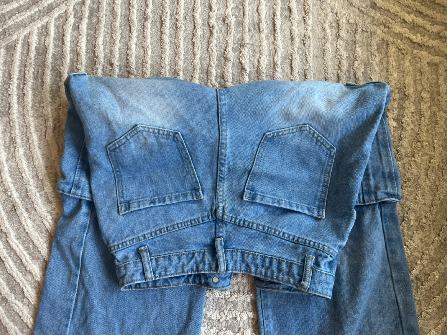 These women's cargo denim pants have a light wash blue colour. They're made of denim and feature a classic pocket style with additional cargo pockets on the legs. These pants are great for casual wear.