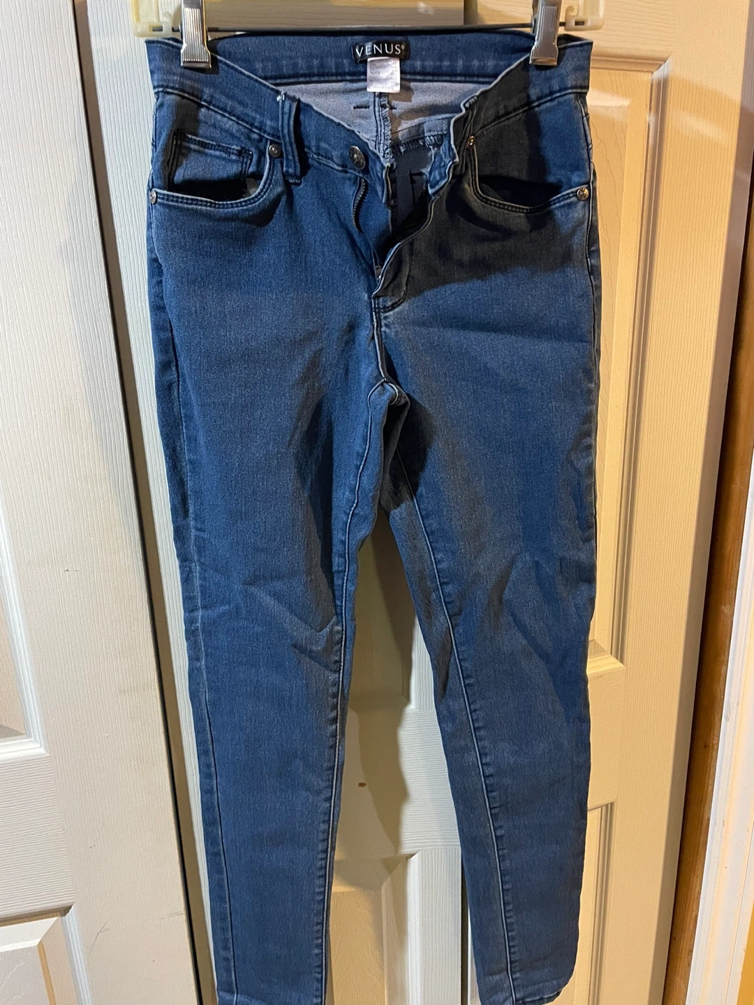 These are VENUS women's blue denim jeans. They're a classic skinny fit with a mid-rise waist. Made from a comfortable stretch denim fabric.