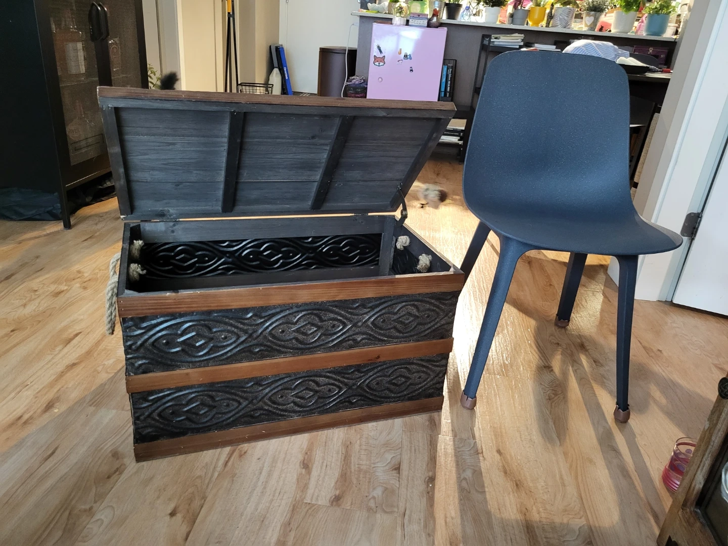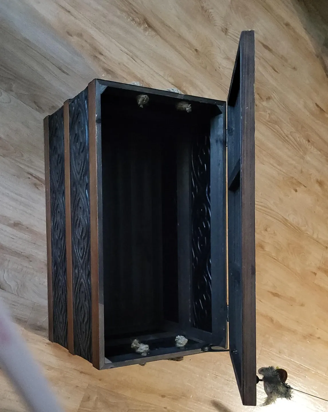 This decorative wooden chest box features intricate carved detailing along its sides. It has rope handles for easy carrying. The lid opens to reveal a spacious interior for storage. A great piece for adding a rustic touch to any room! Sorry cat not included