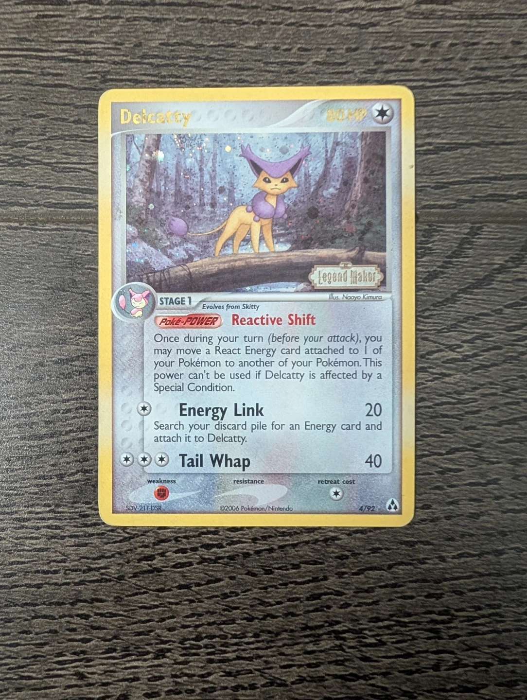 This is a Delcatty trading card from the "Legend Maker" set, featuring the Poke-Power "Reactive Shift". It has the "Energy Link" and "Tail Whap" attacks. Copyrighted 2004 by Nintendo.