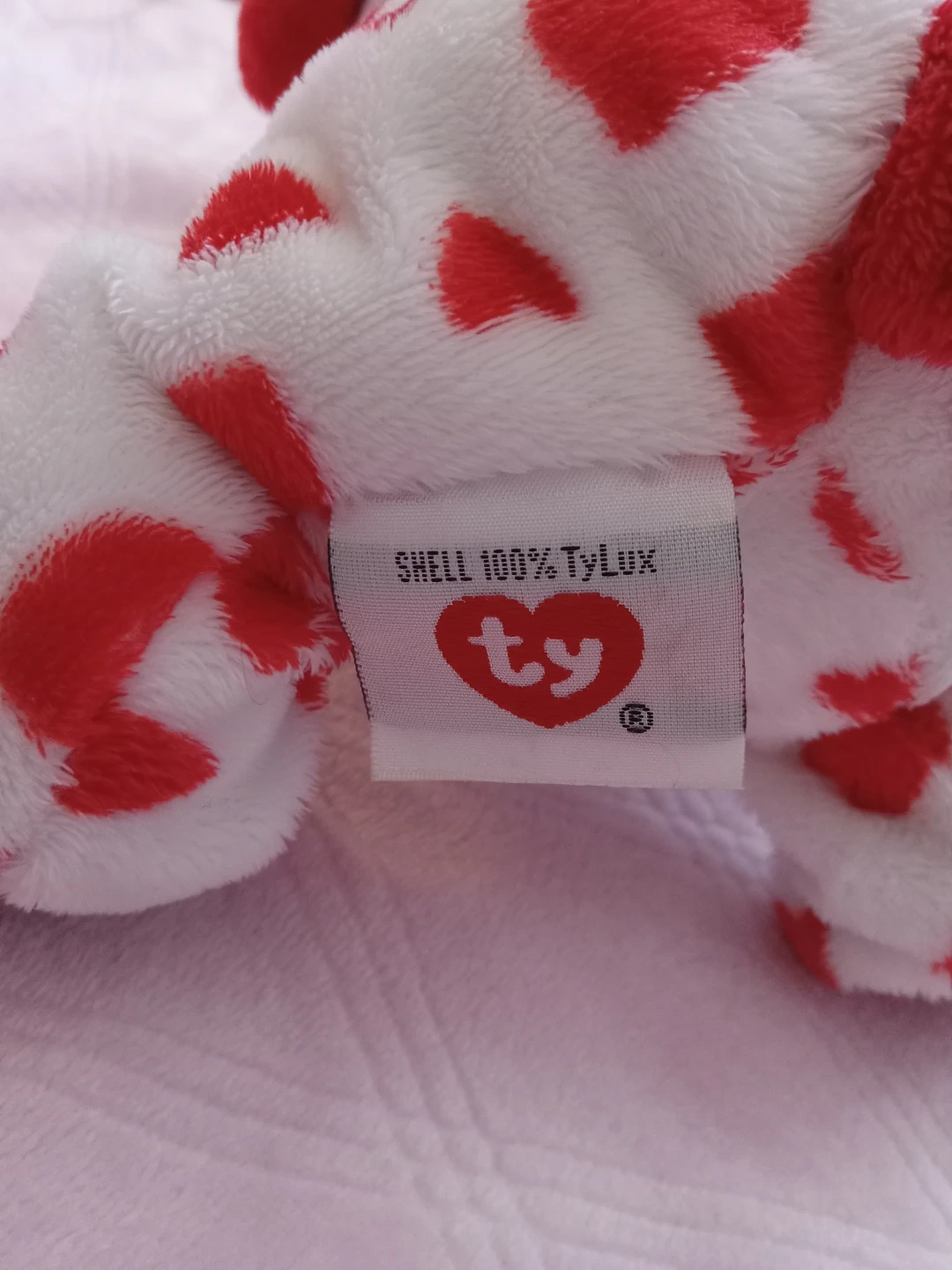This is a Ty Beanie Baby plush toy dog with a red heart pattern. It's made with 100% TyLux material. This cuddly toy is perfect for collectors or as a sweet gift!